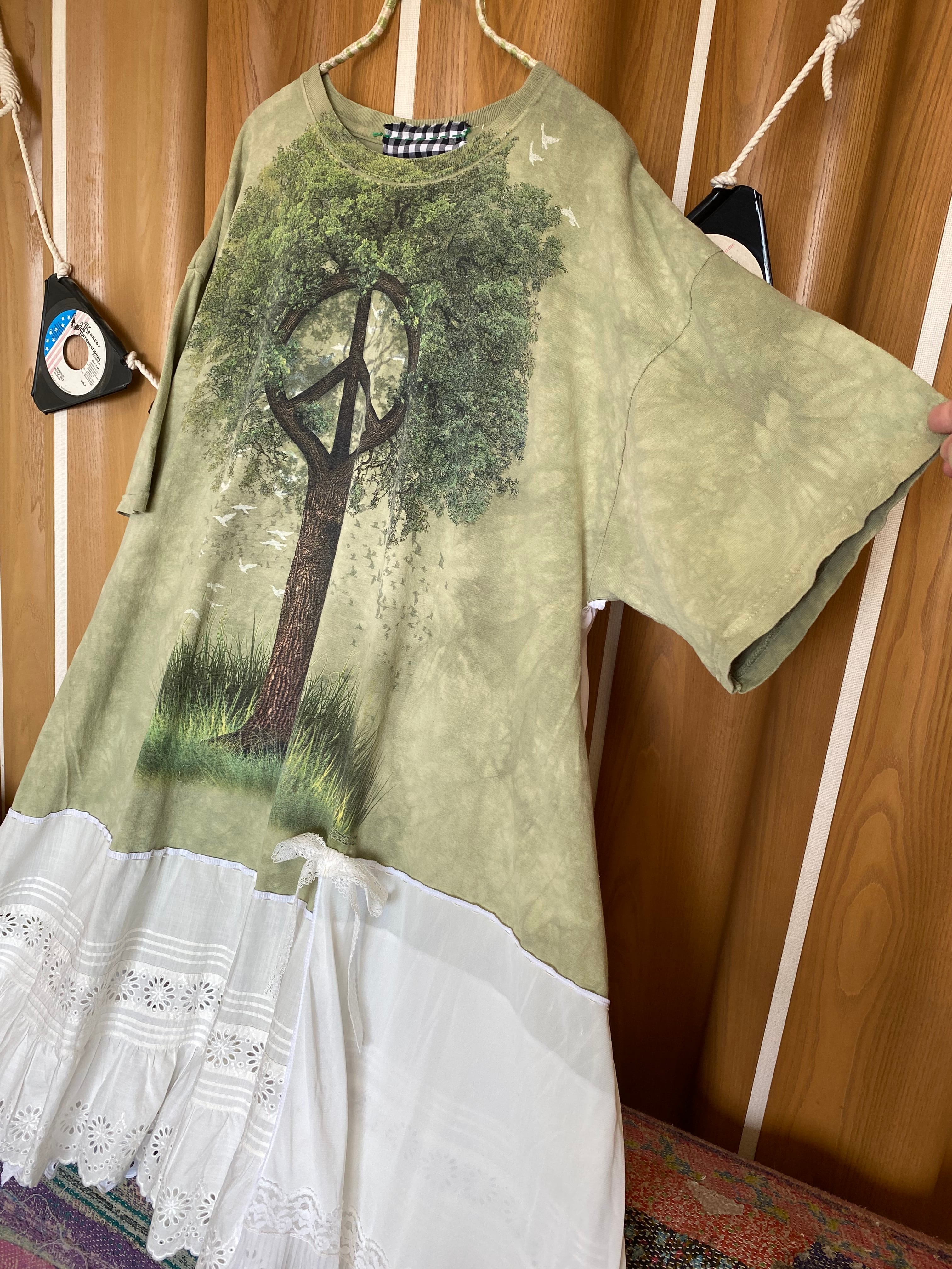 THE MOUNTAINのピース柄の古着のビッグTシャツと、古着のレーススカートや古着のペチコートを組み合わせて、ゆったりとしたロングワンピースを作りました。