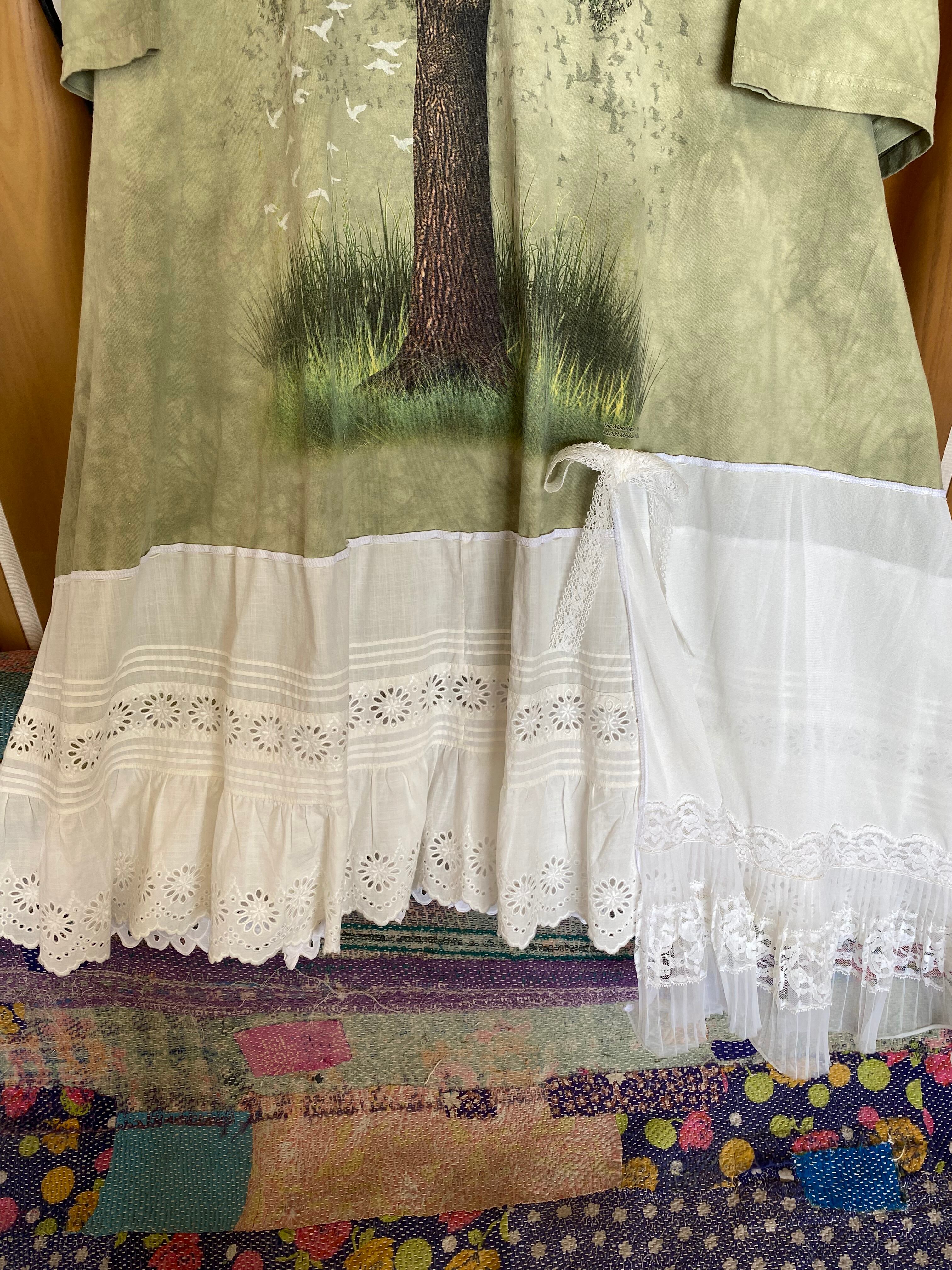 I combined a vintage oversized THE MOUNTAIN peace print T-shirt with a vintage lace skirt and petticoat to create a relaxed, long dress.