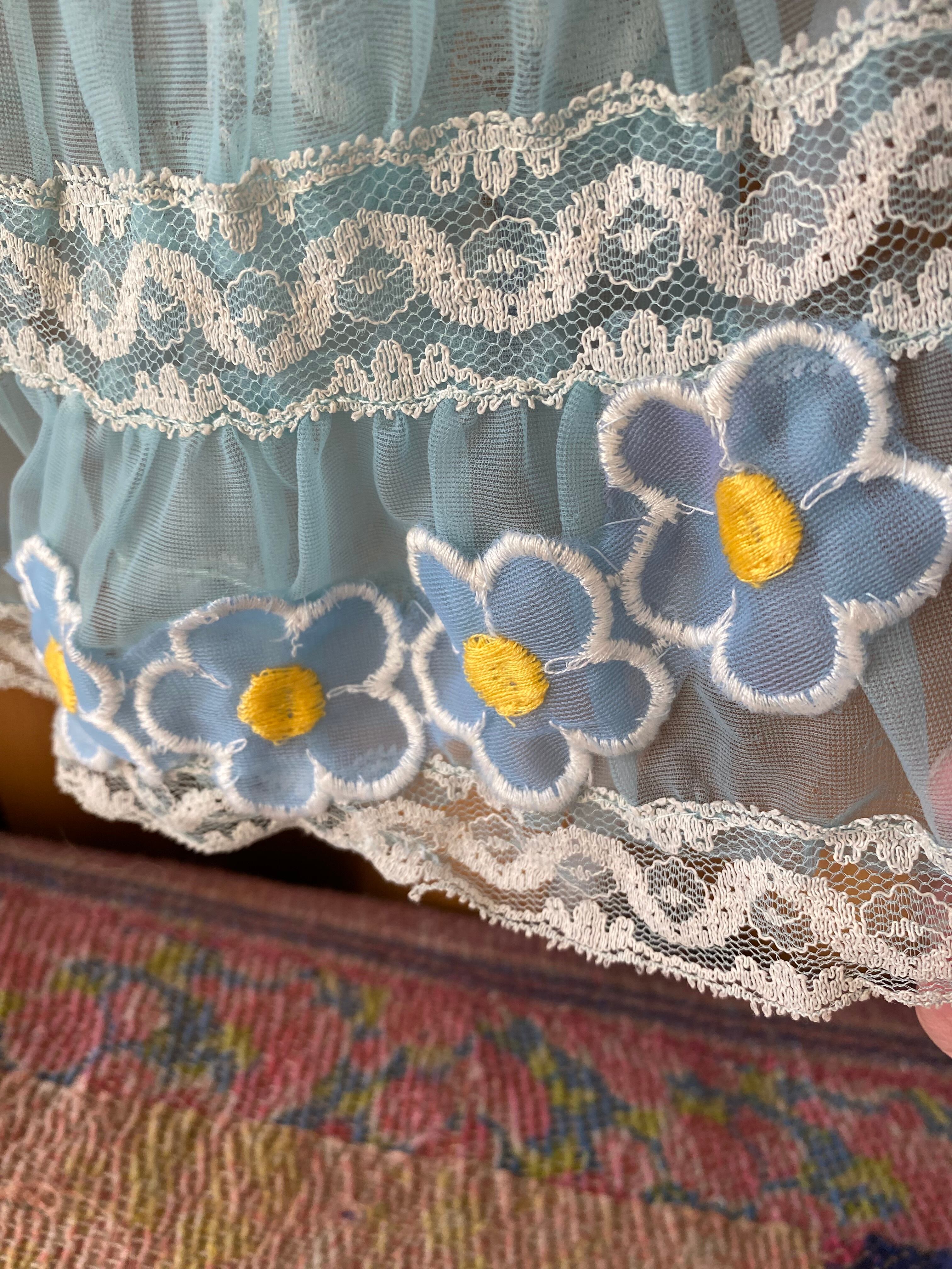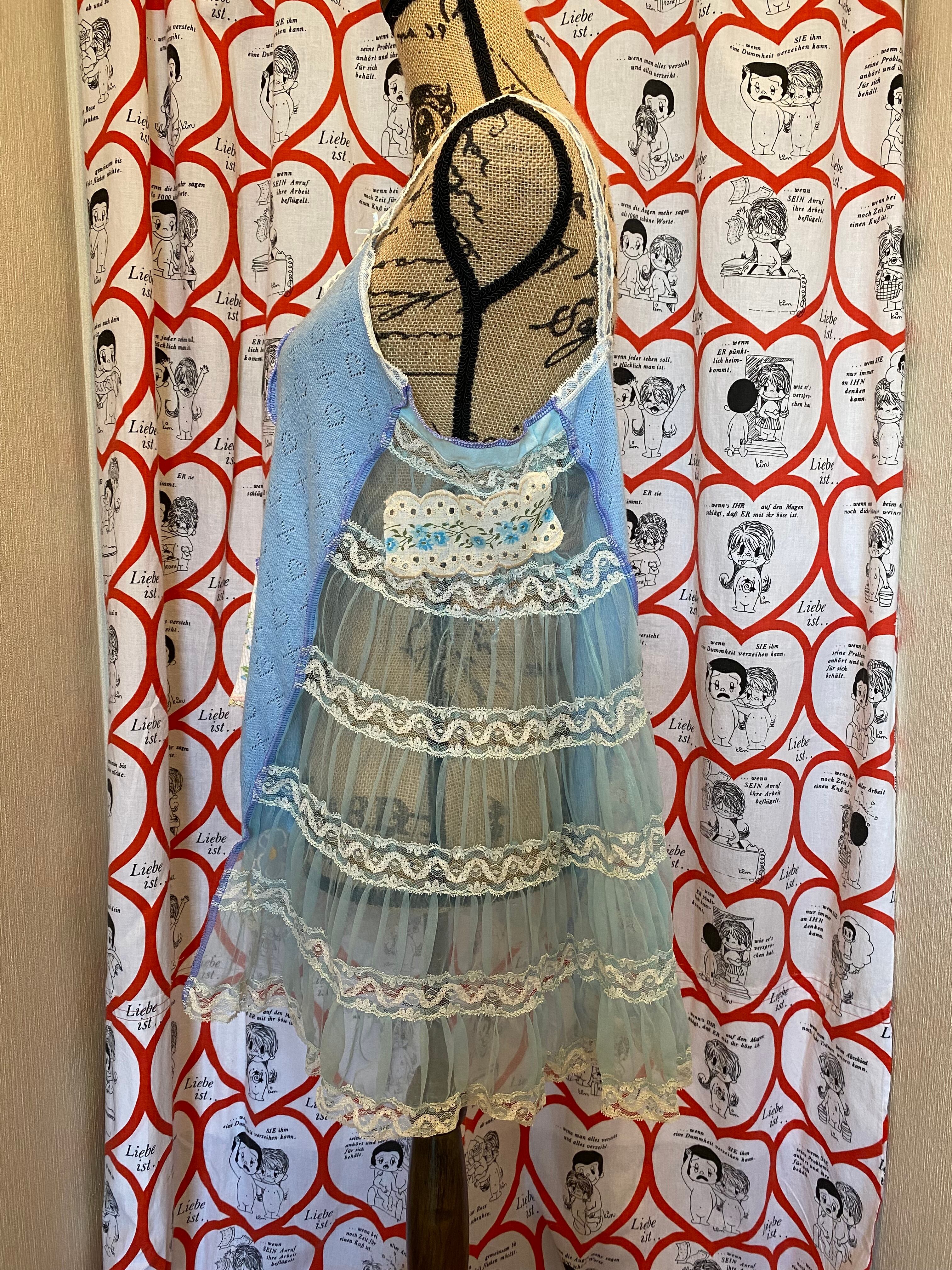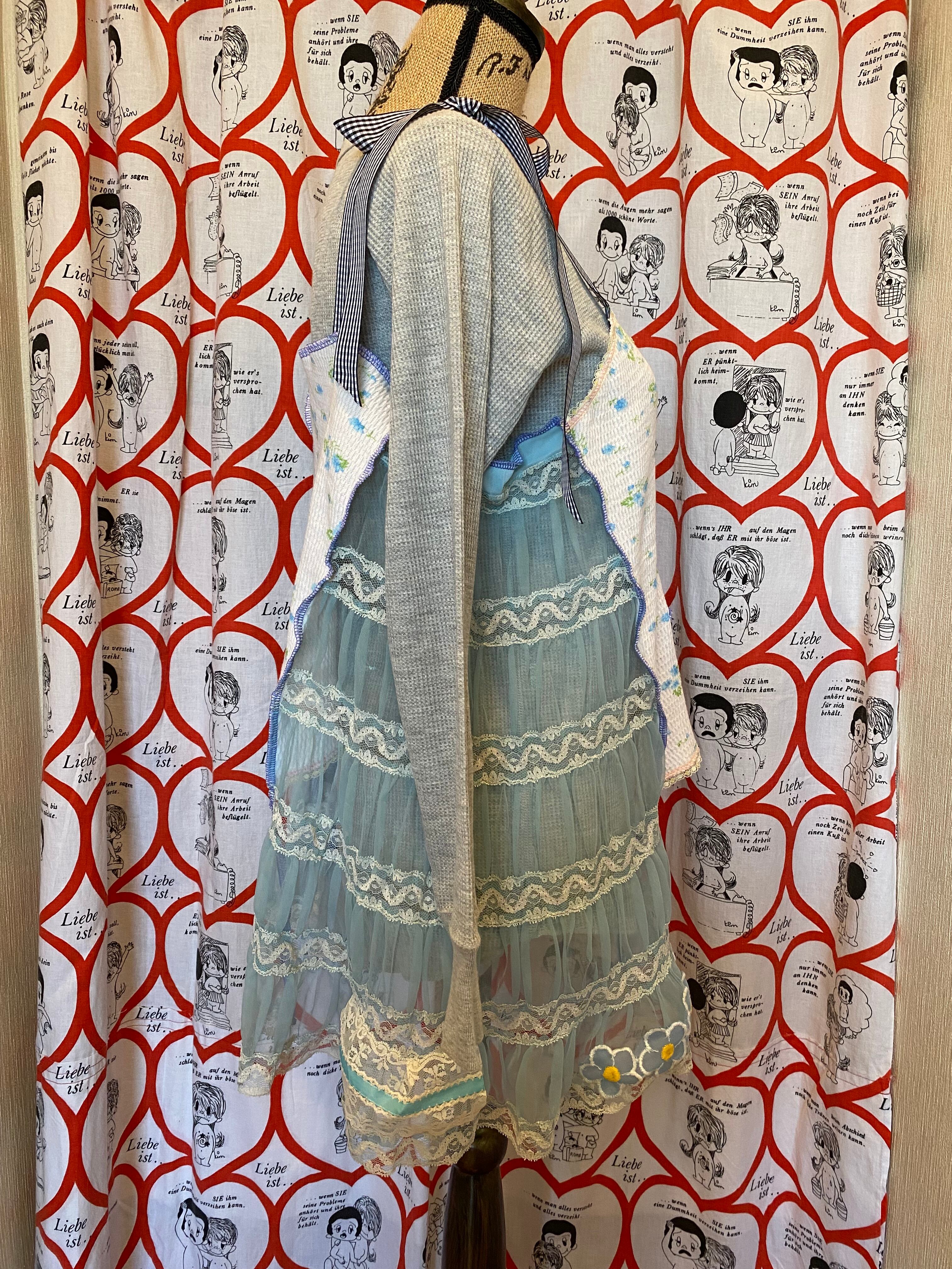 ハートのレースが可愛い2000年代のキャミソールと、花柄のサーマルと1950年代のヴィンテージパニエを組み合わせて、片側肩リボンのキャミソールビスチェを作りました。
