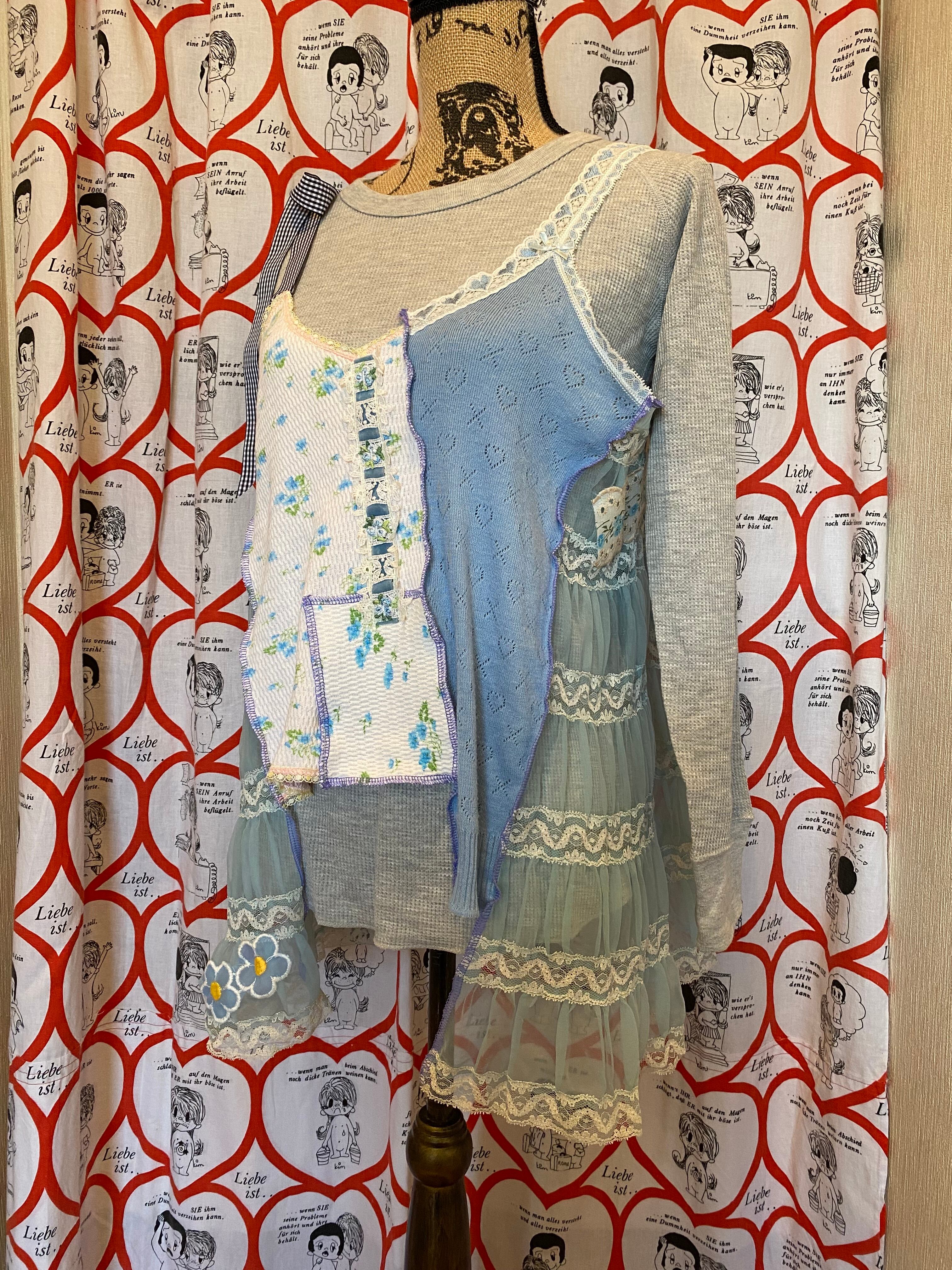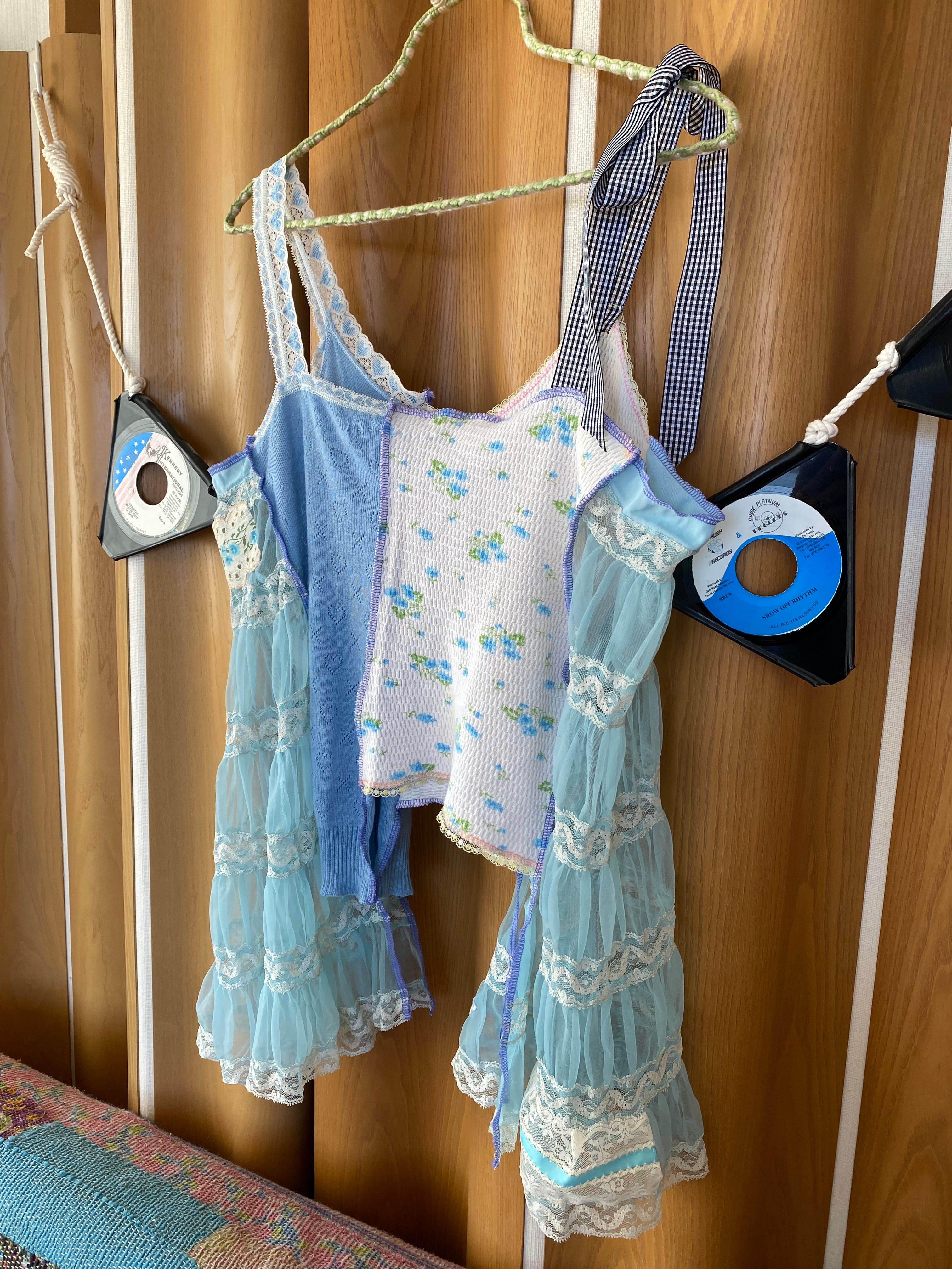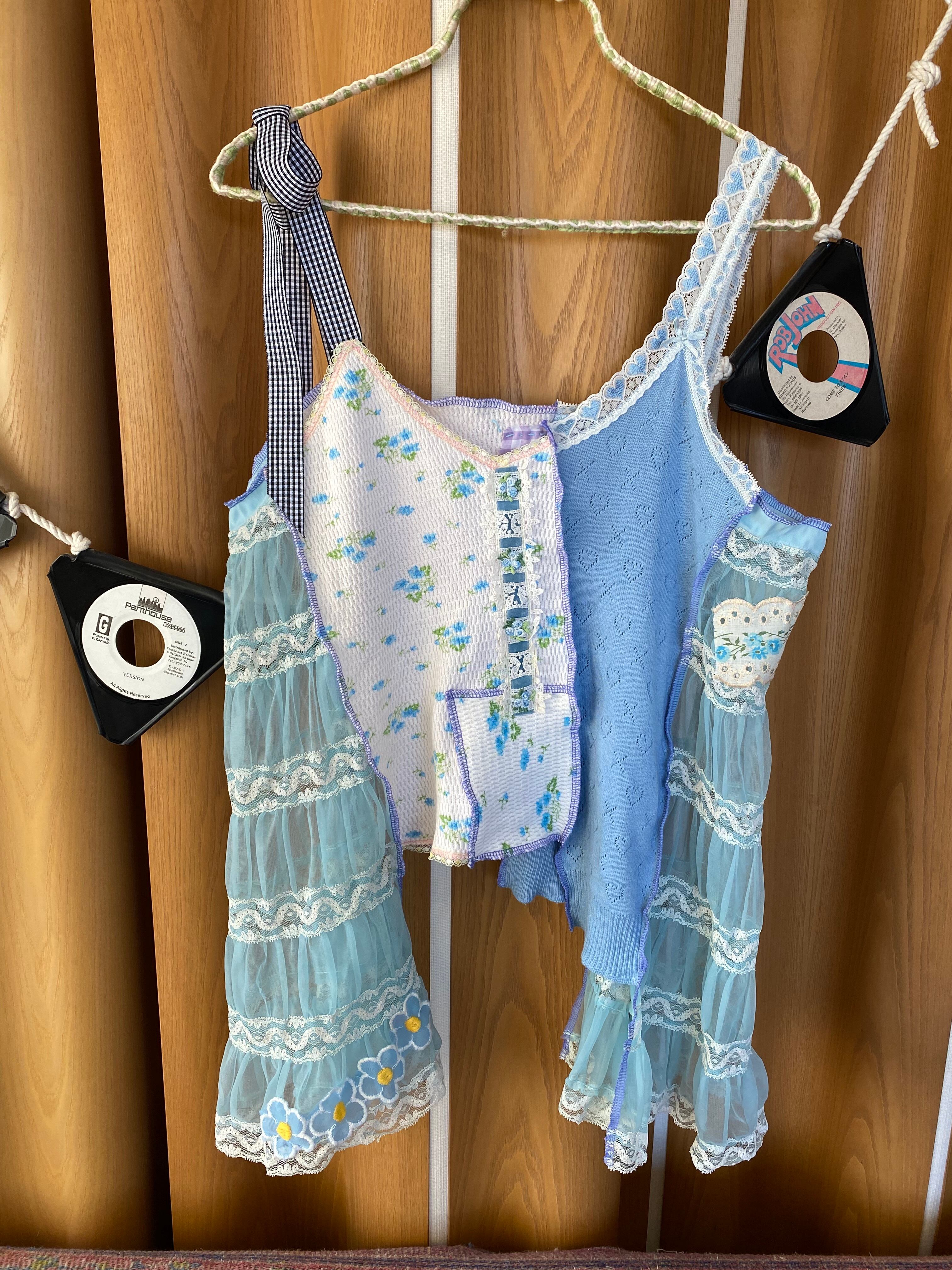 I combined a cute 2000s camisole with heart lace, a floral thermal, and a vintage 1950s panniers to create a camisole bustier with a ribbon on one shoulder.