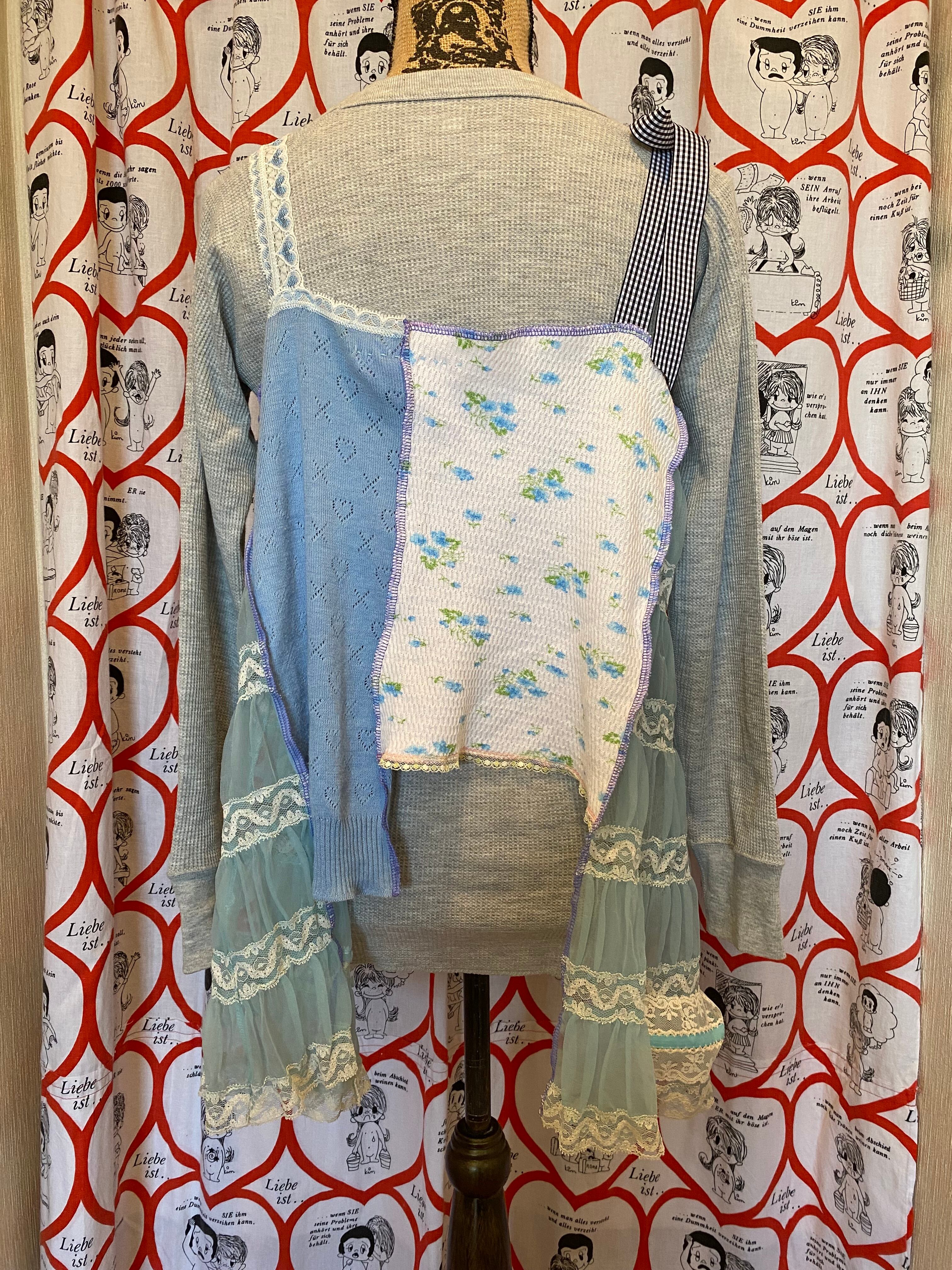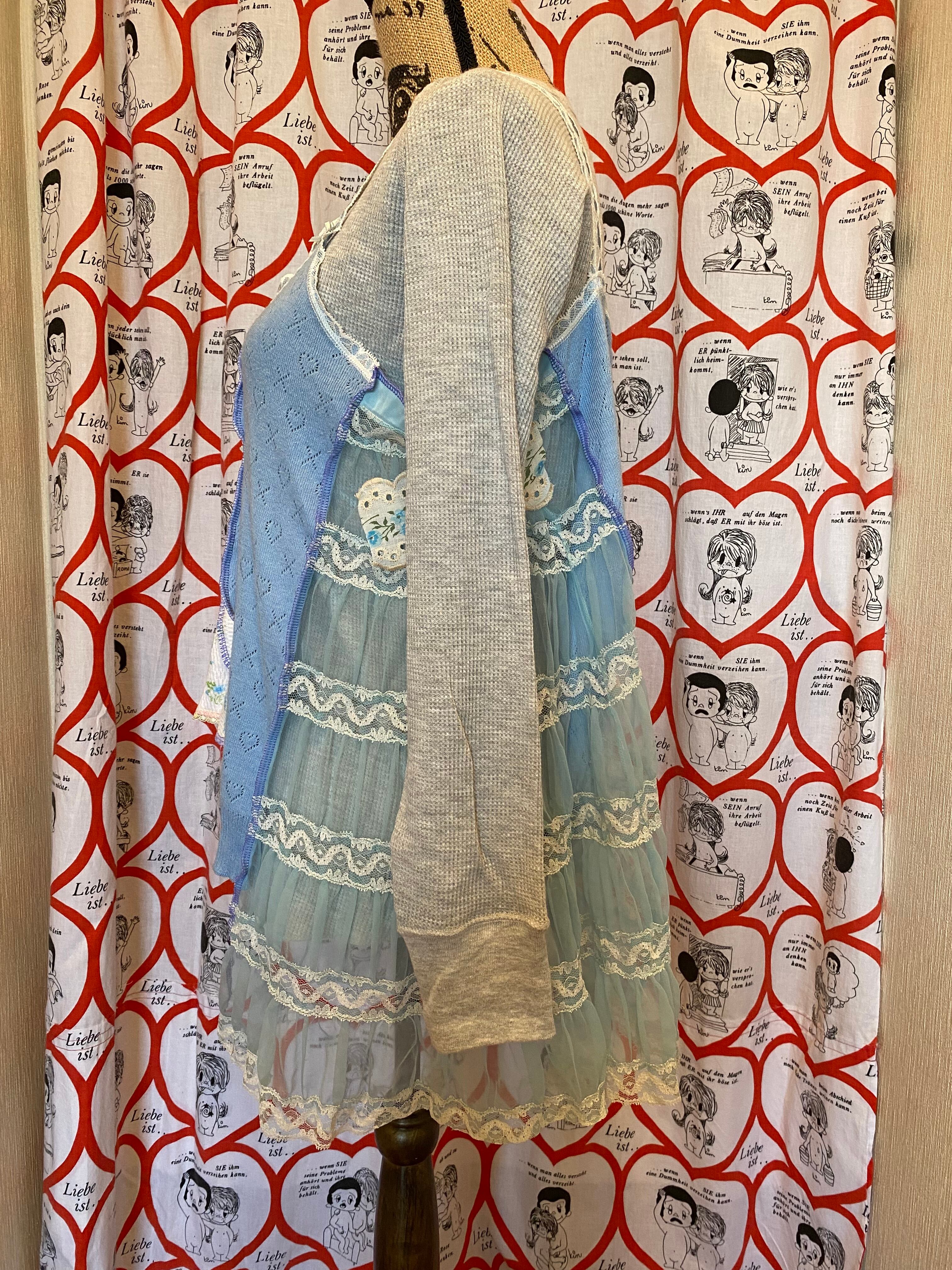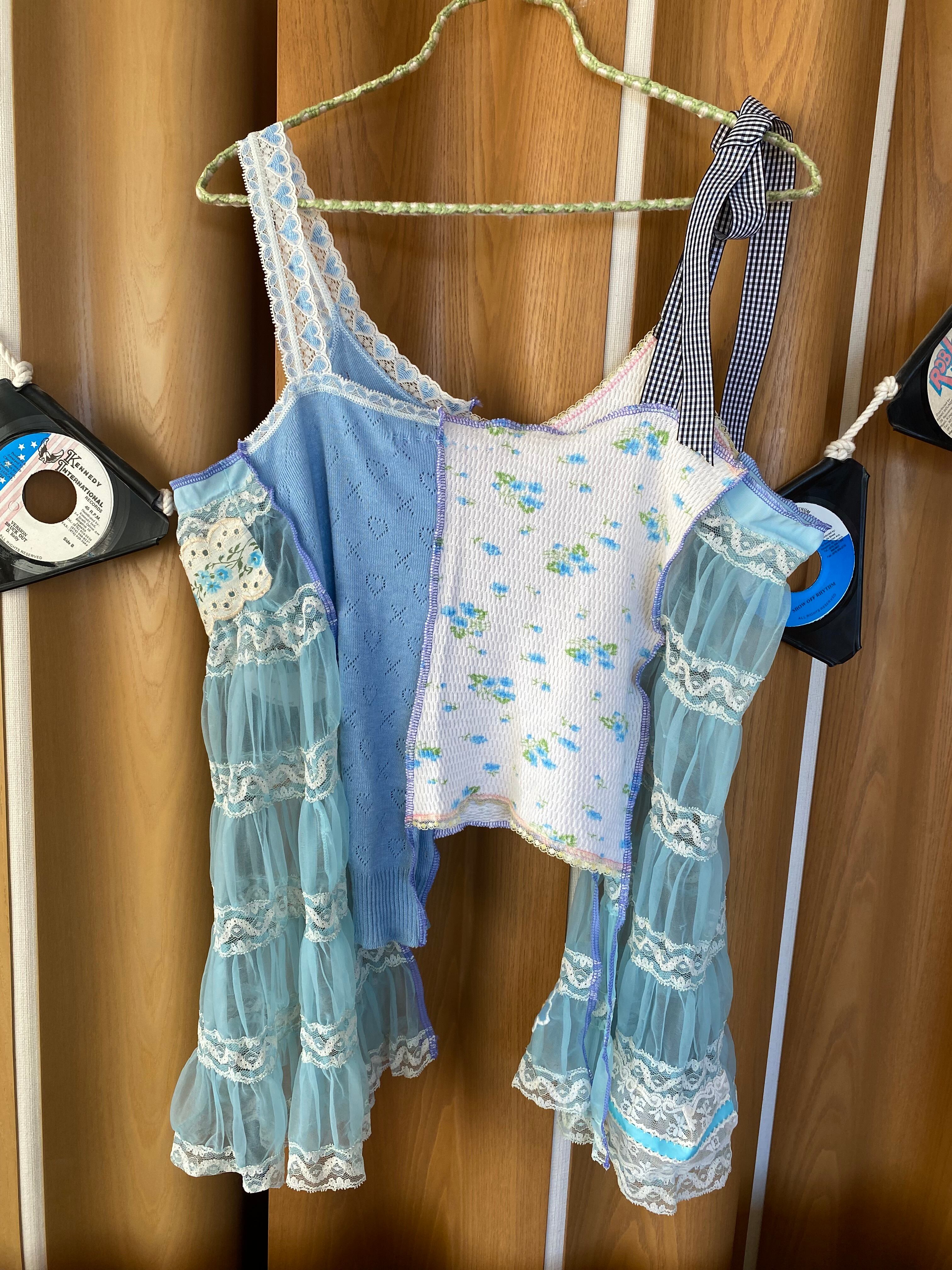 I combined a cute 2000s camisole with heart lace, a floral thermal, and a vintage 1950s panniers to create a camisole bustier with a ribbon on one shoulder.
