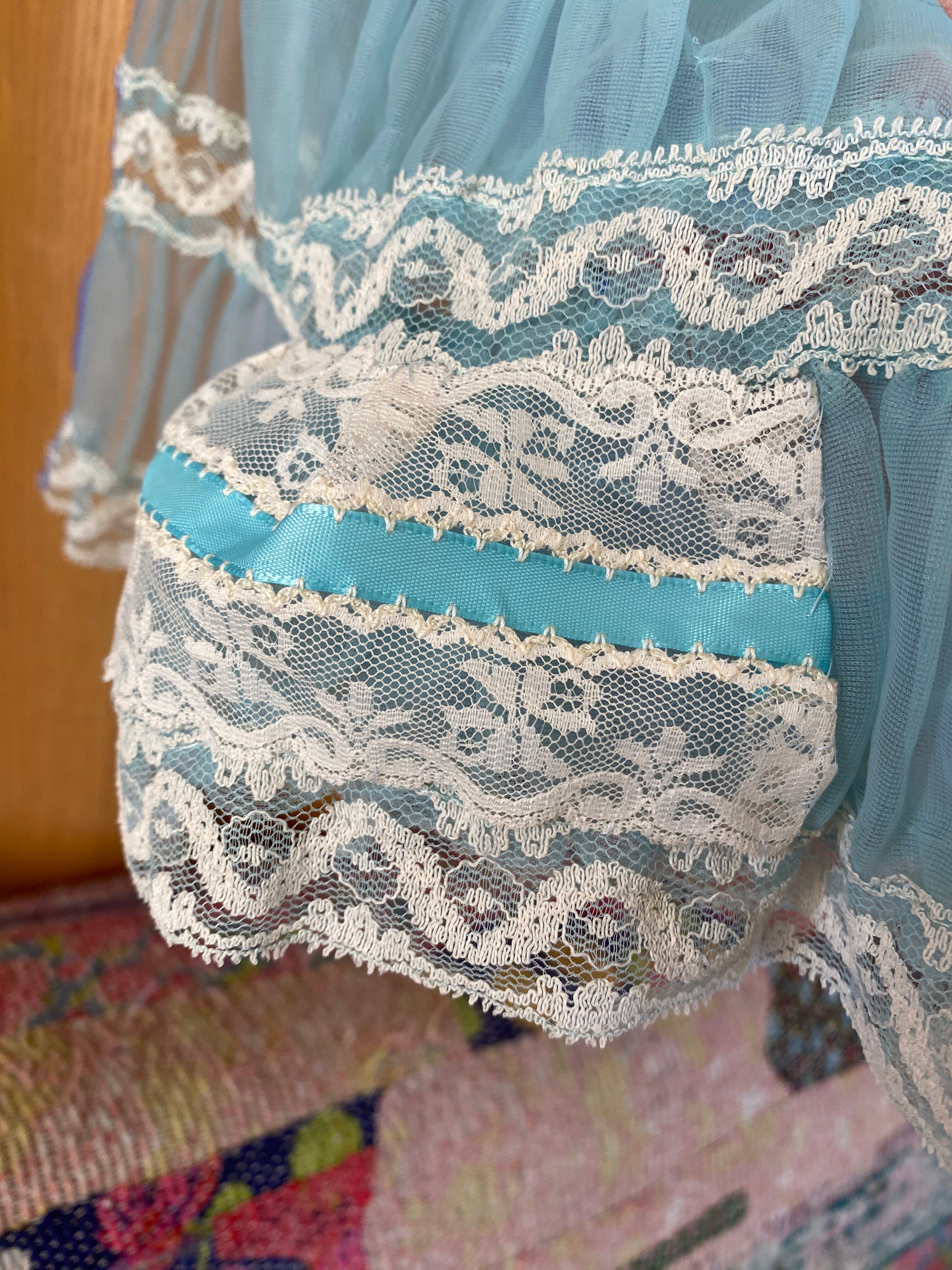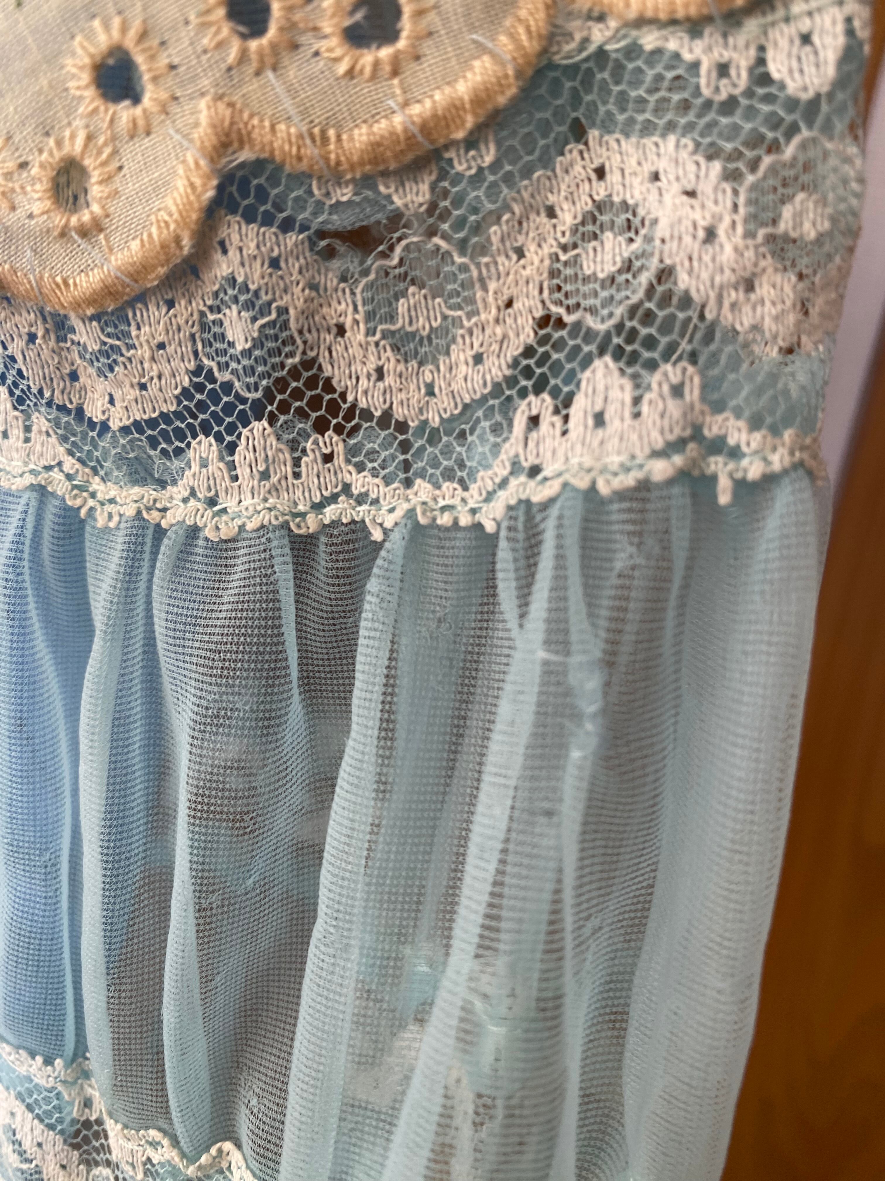 画像にありますようにパニエ部分に引っ掛けキズがところどころにあります。穴が開いていた箇所は補修して、ヴィンテージレースやモチーフを縫い付けました。