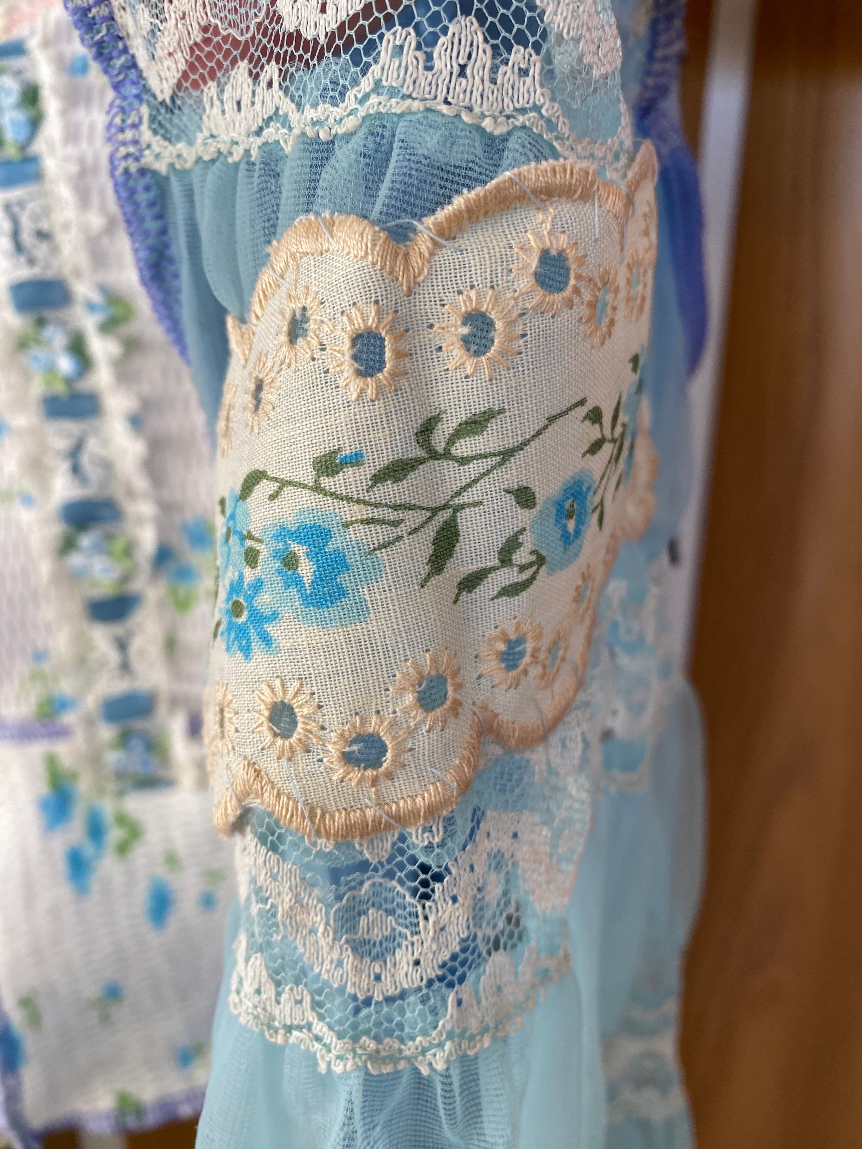 As you can see in the photo, there are some scratches on the panniers from snagging. I repaired the holes and sewed on vintage lace and motifs.