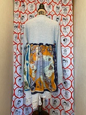 I sewed a Bindu bandana (Paris, Hawaii, and two Texas designs) onto a brand new men's XL thermal shirt, and sewed two old off-white slips onto it so that they were visible from the hem, to create a loose-fitting tunic dress.