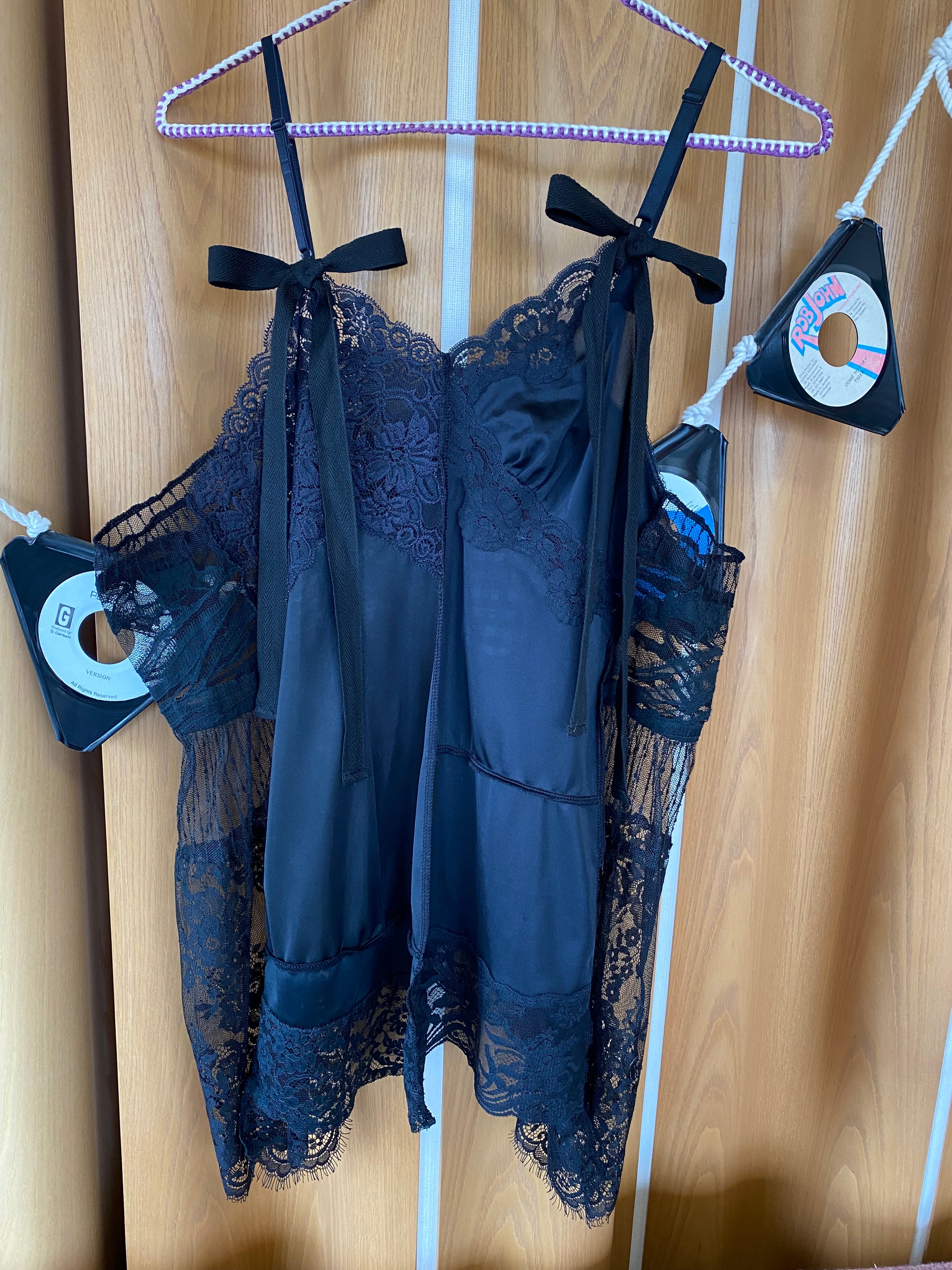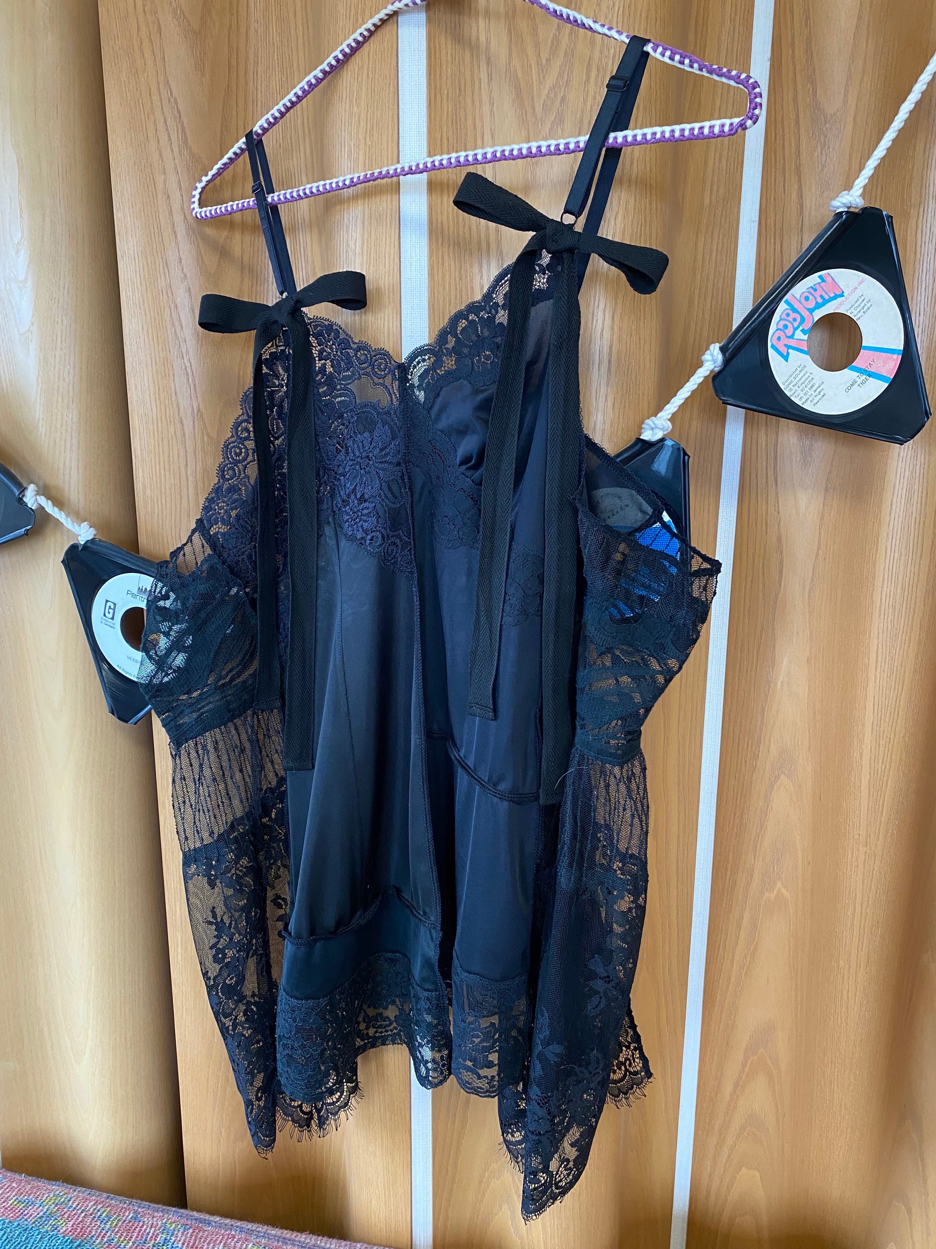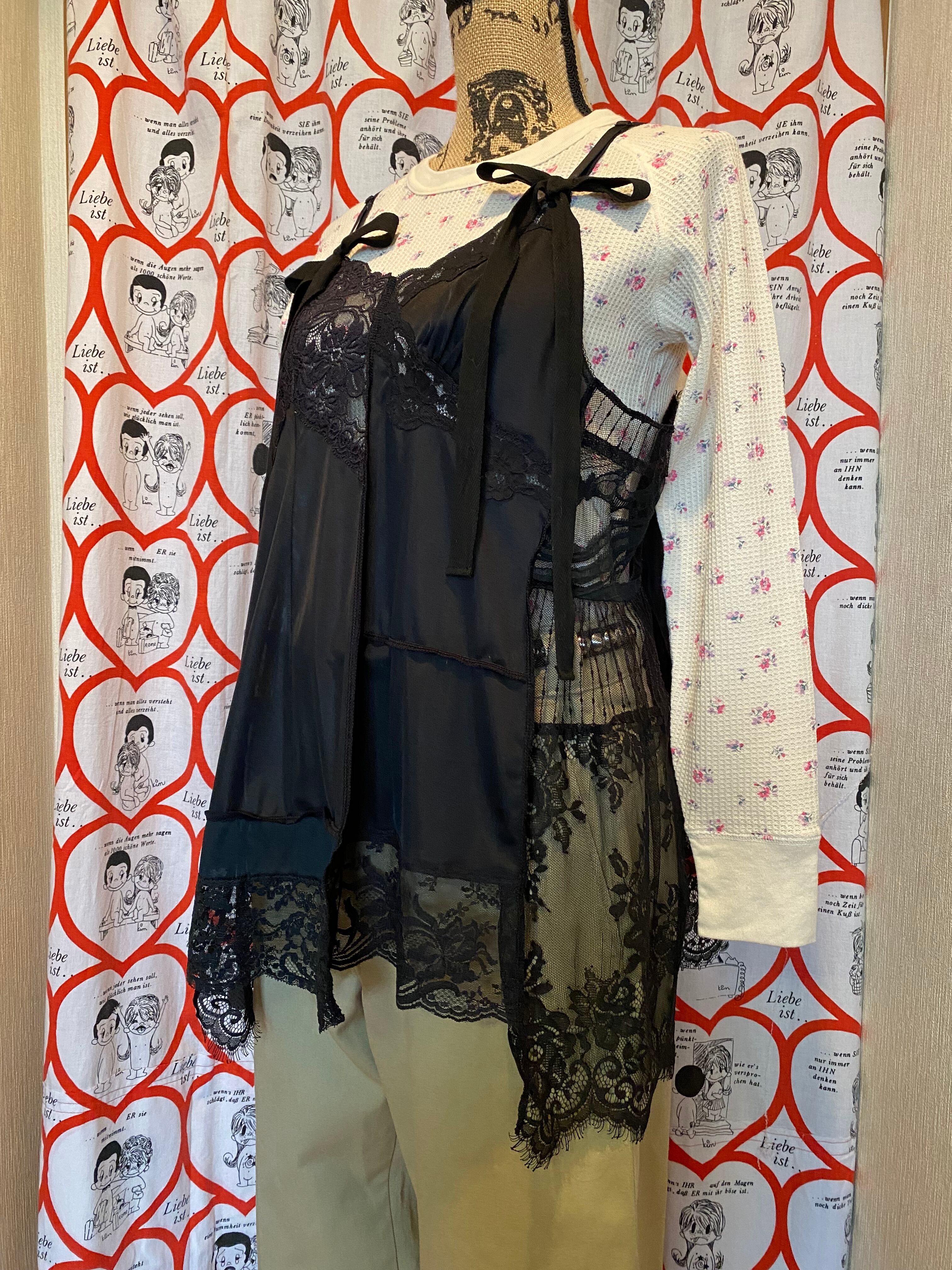 二枚の古着のスリップを真ん中でドッキングさせて、古着のレーススカートの裾部分も縫い足して、ゆったりとしたキャミソールビスチェを作りました。