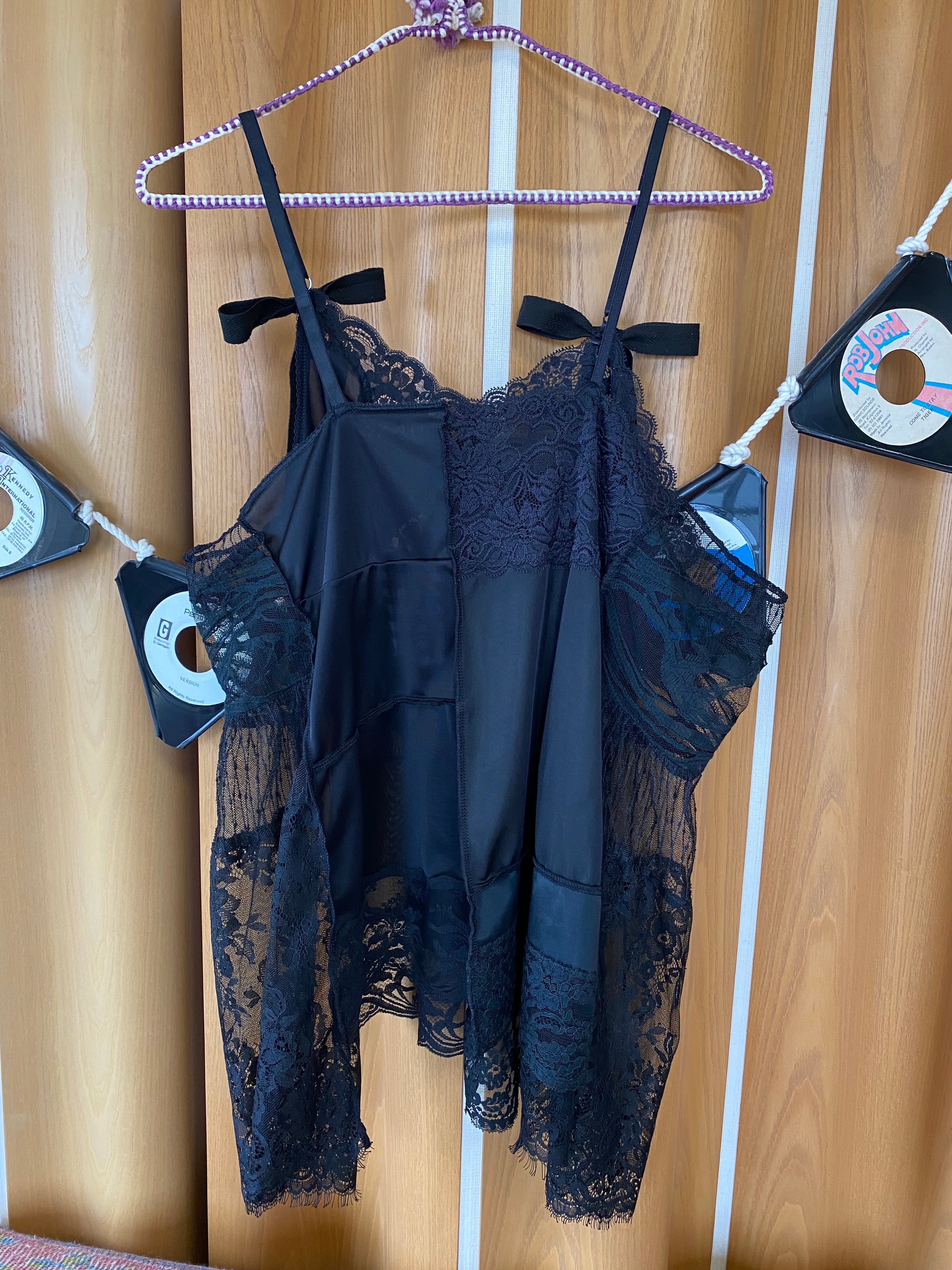 I made a loose-fitting camisole bustier by joining two vintage slips together in the middle and sewing on the hem of a vintage lace skirt.