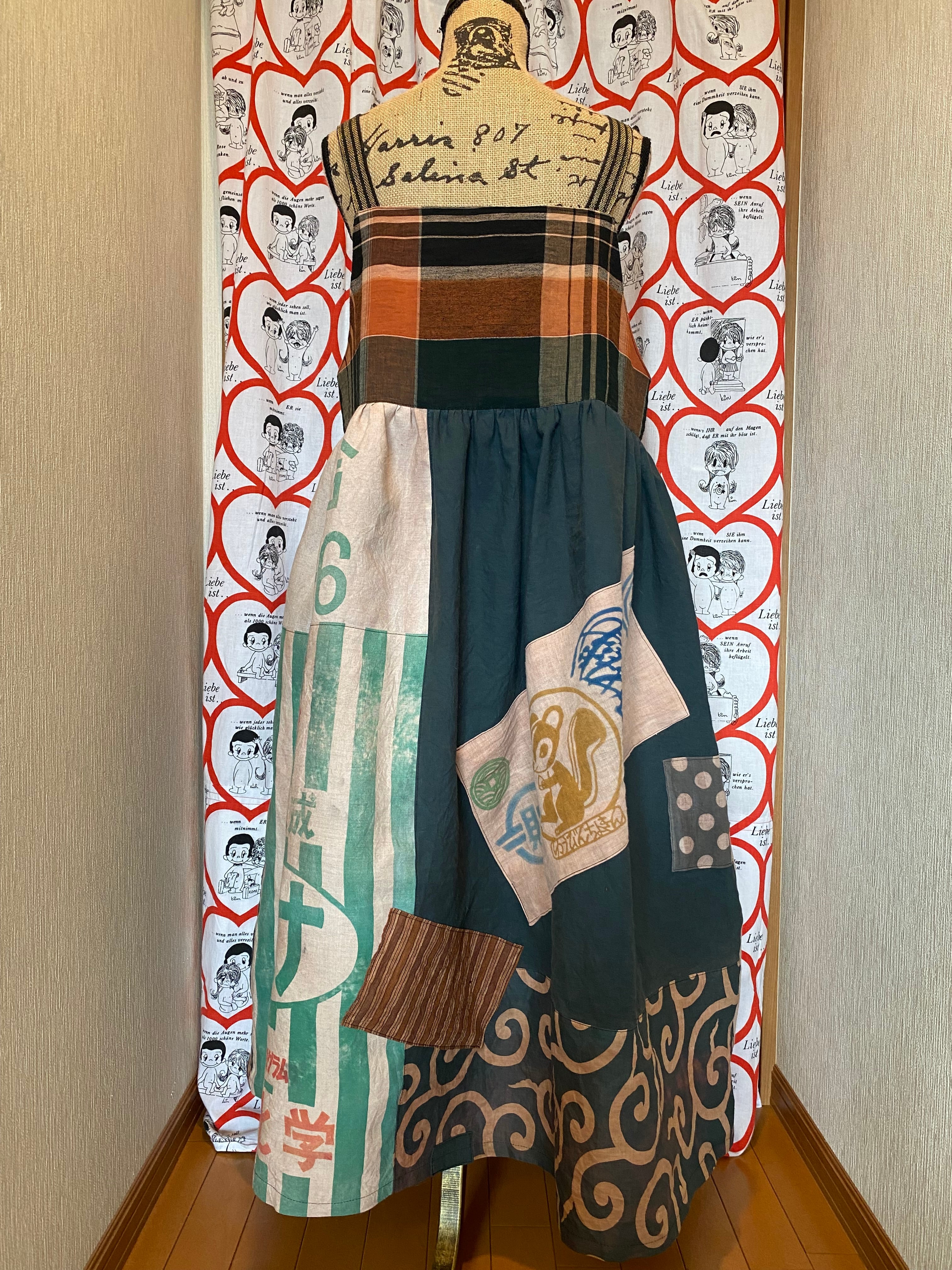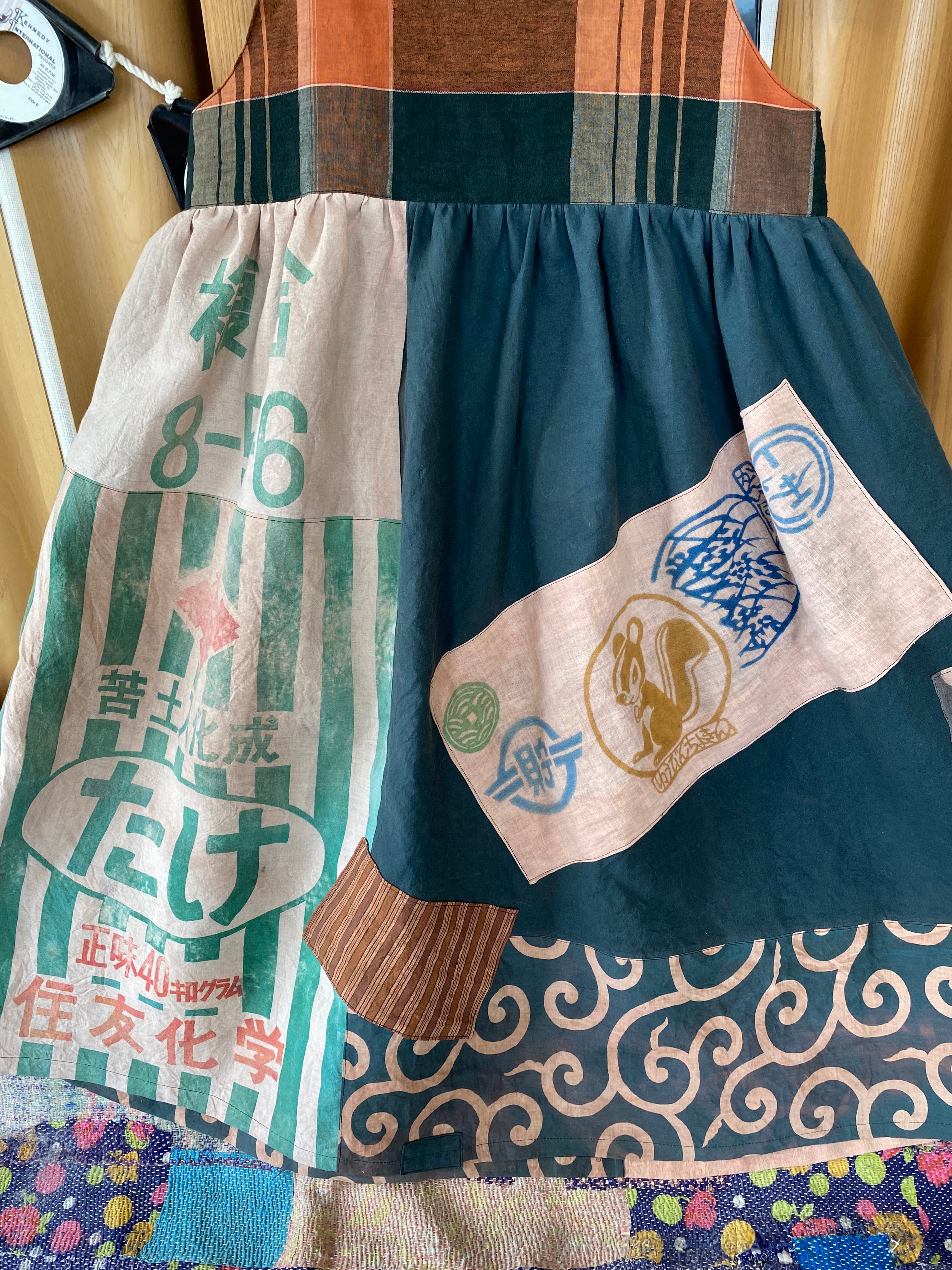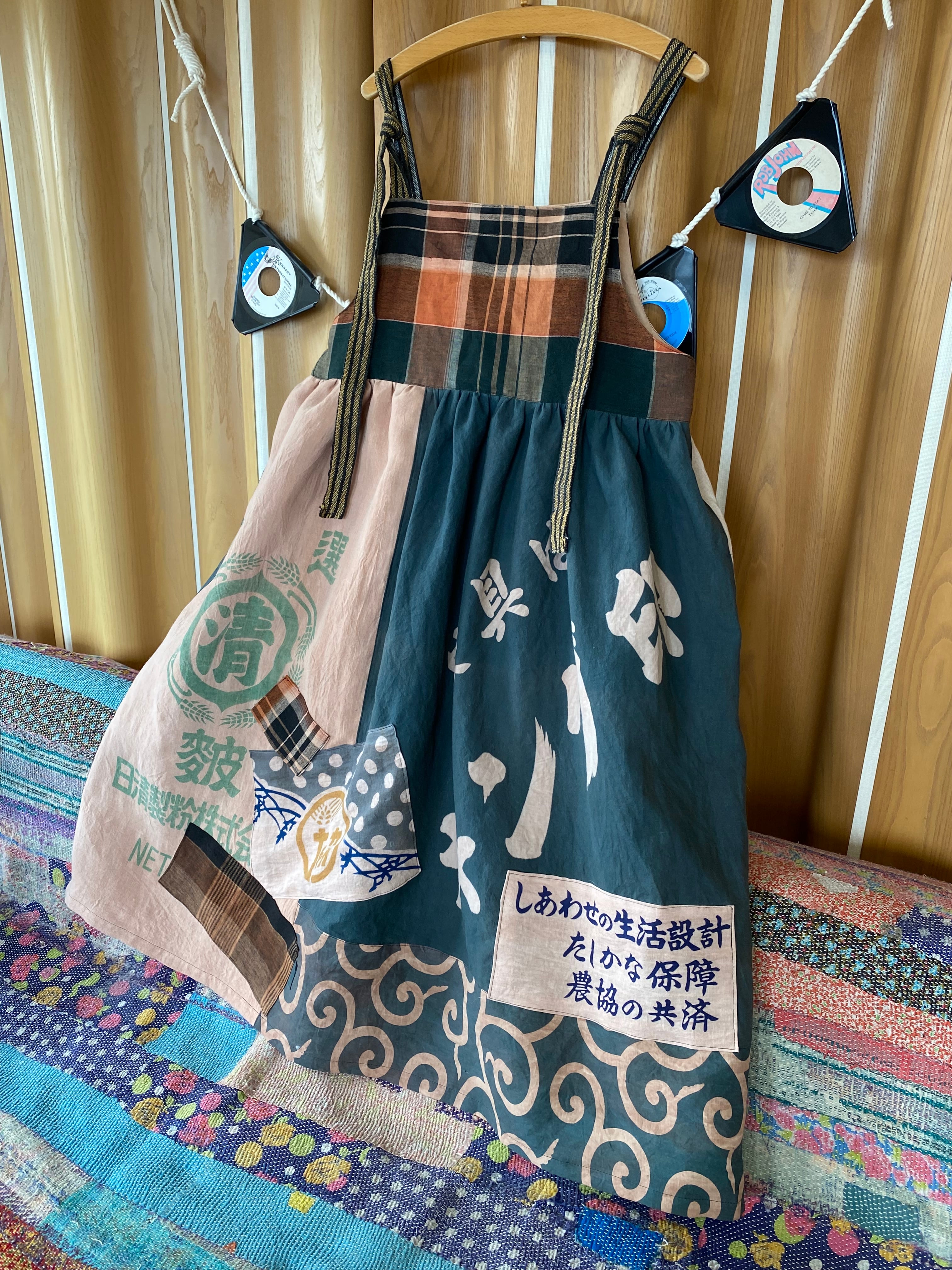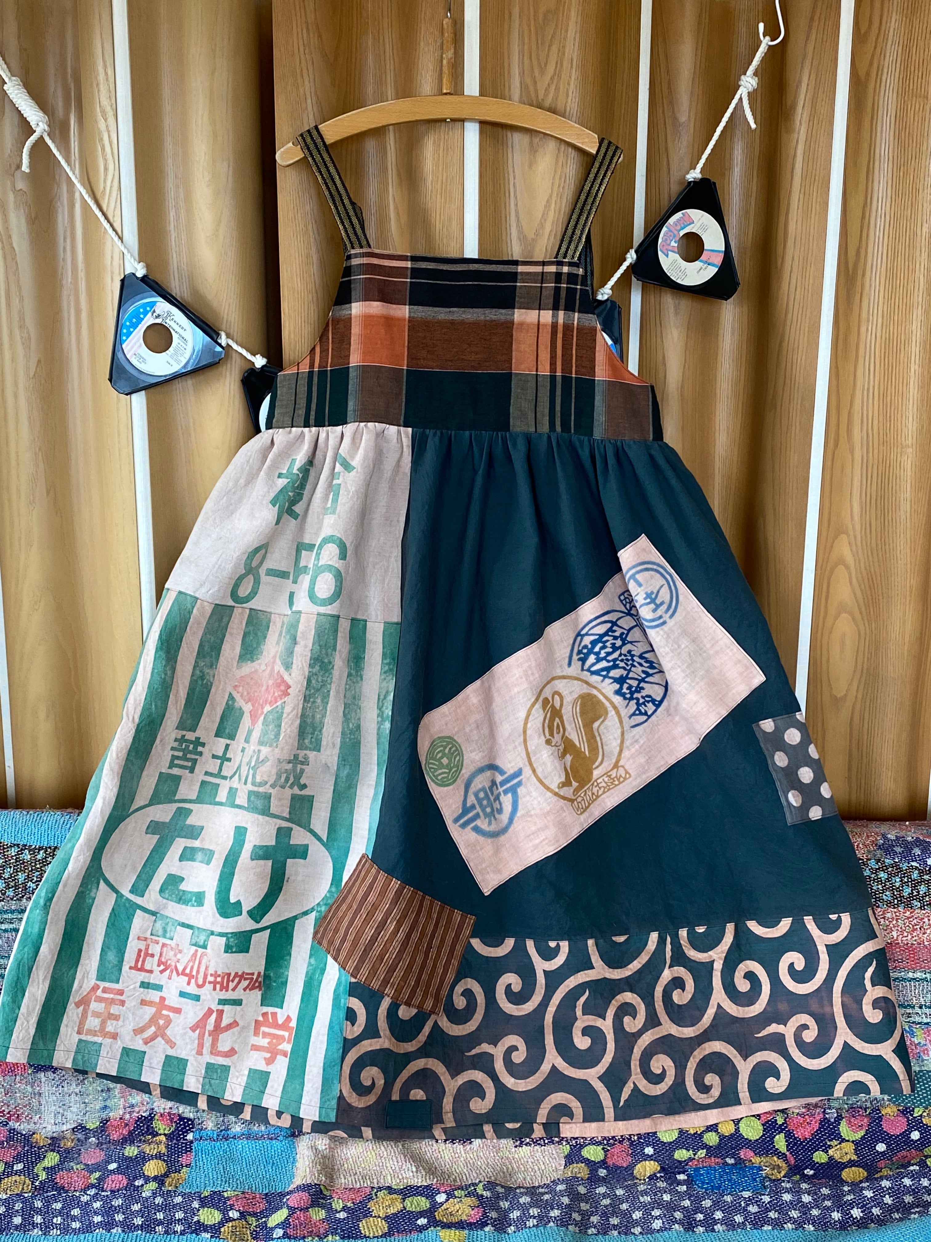 リメイク 昭和レトロ風呂敷粉袋柿渋染めリメイクジャンドレ