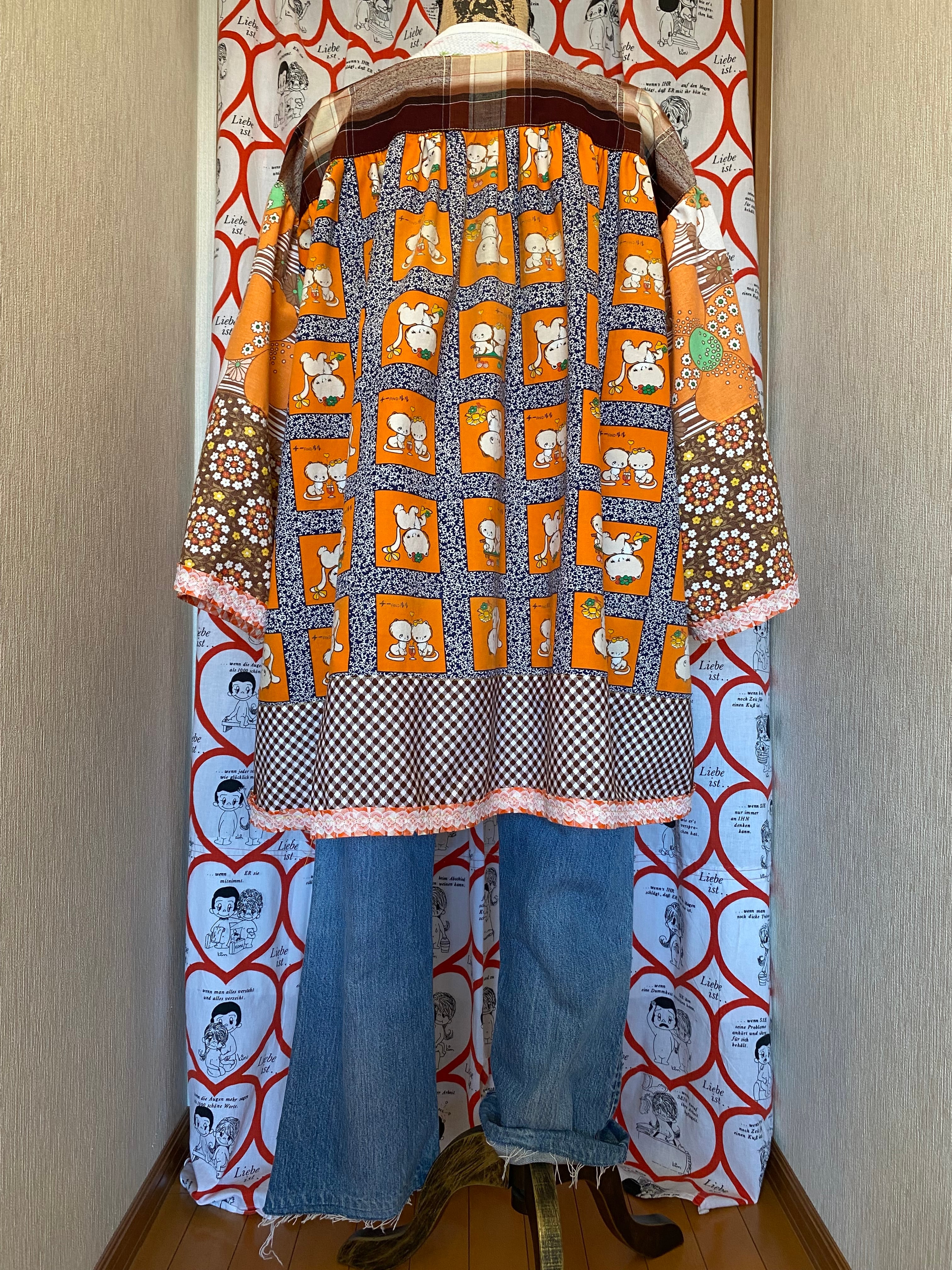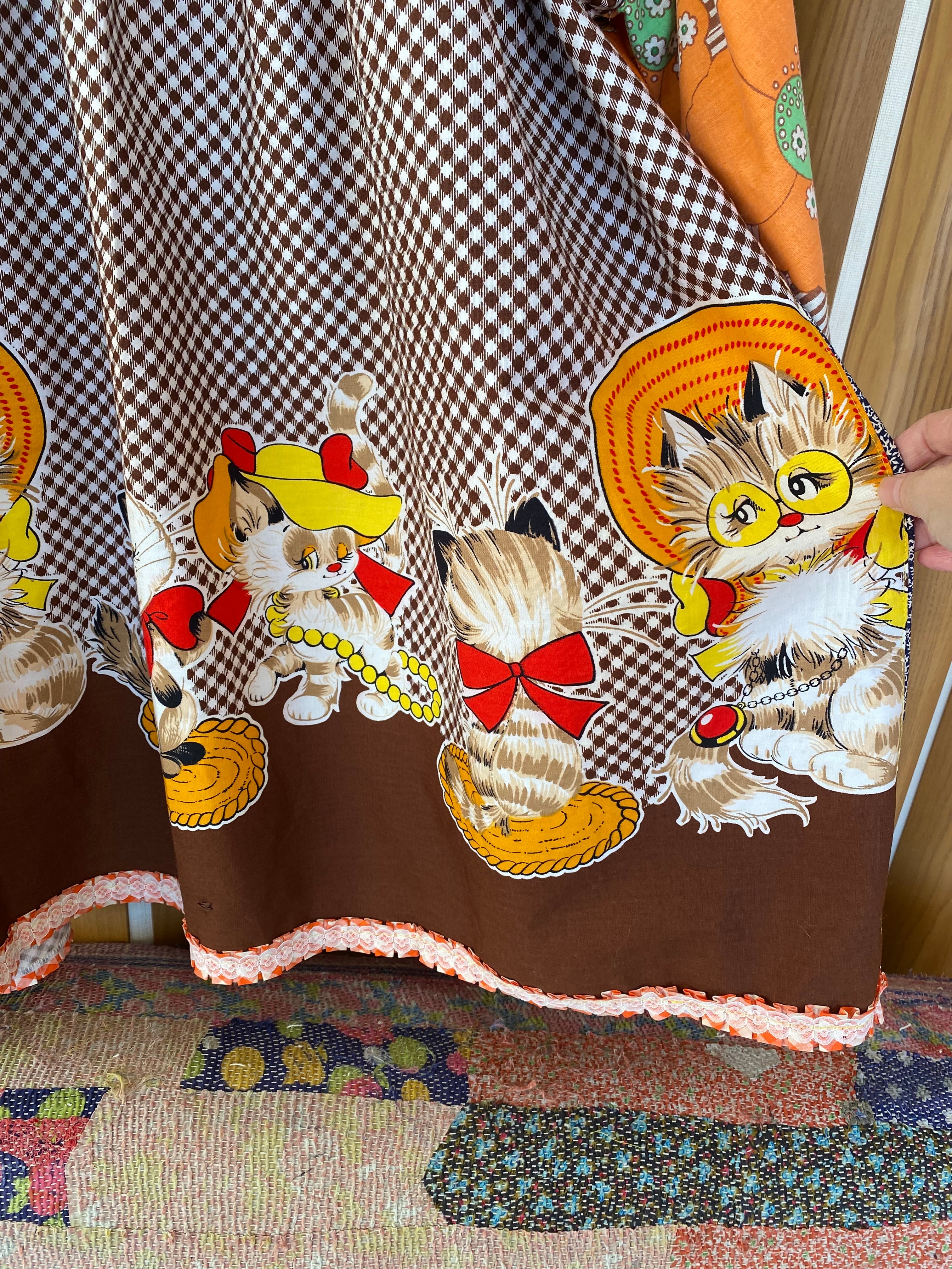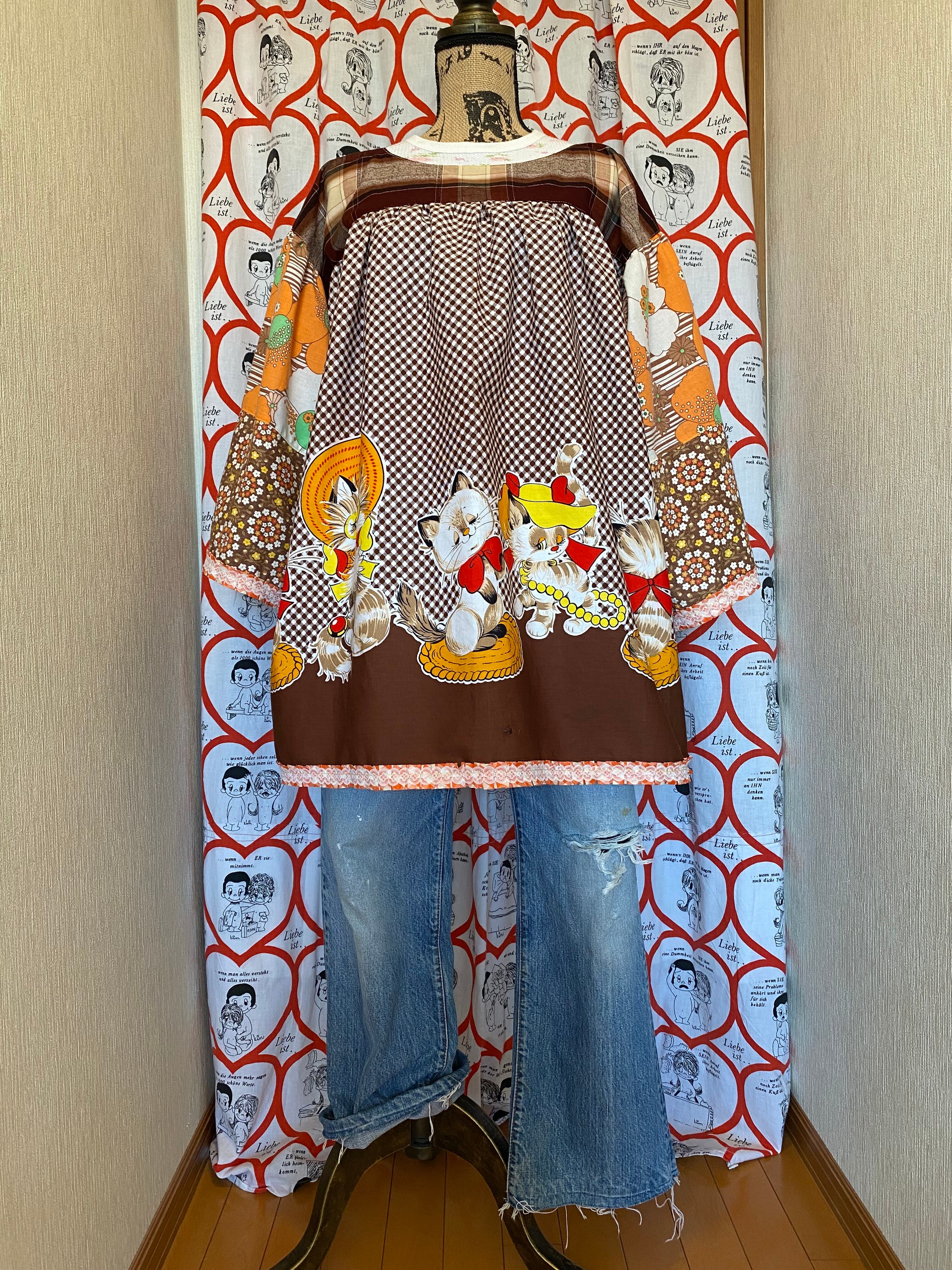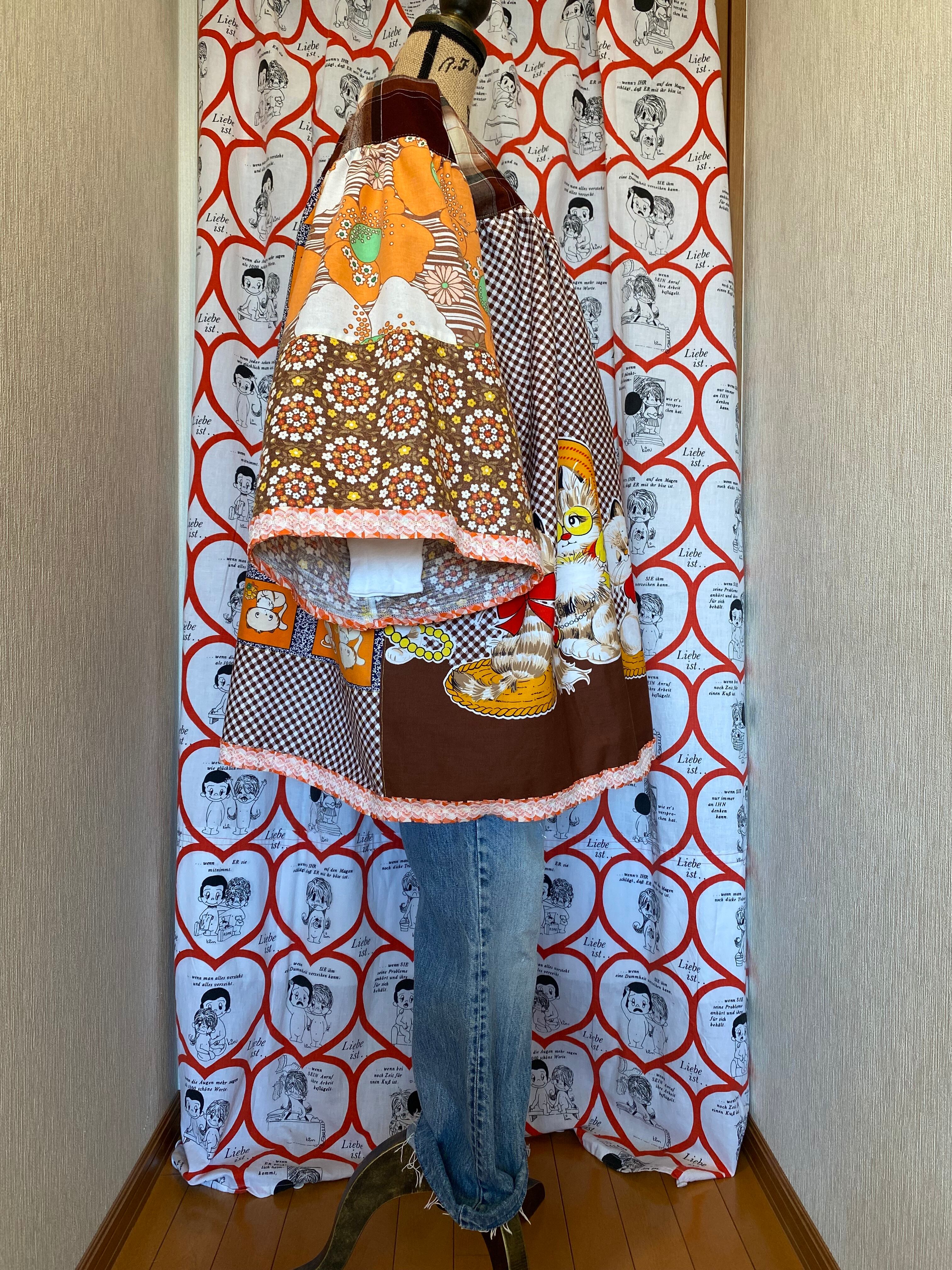 #Nyaoko#remake#fashion#handmade#upcycled #eshikar #sustainable#リメイク#ファッション#ハンドメイド#アップサイクル#エシカル#サスティナブル#昭和レトロ#布団皮#猫#花柄#レトロアニマル#レトロプリント#格子#ギンガムチェック#ファンシー#1970年代