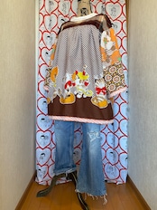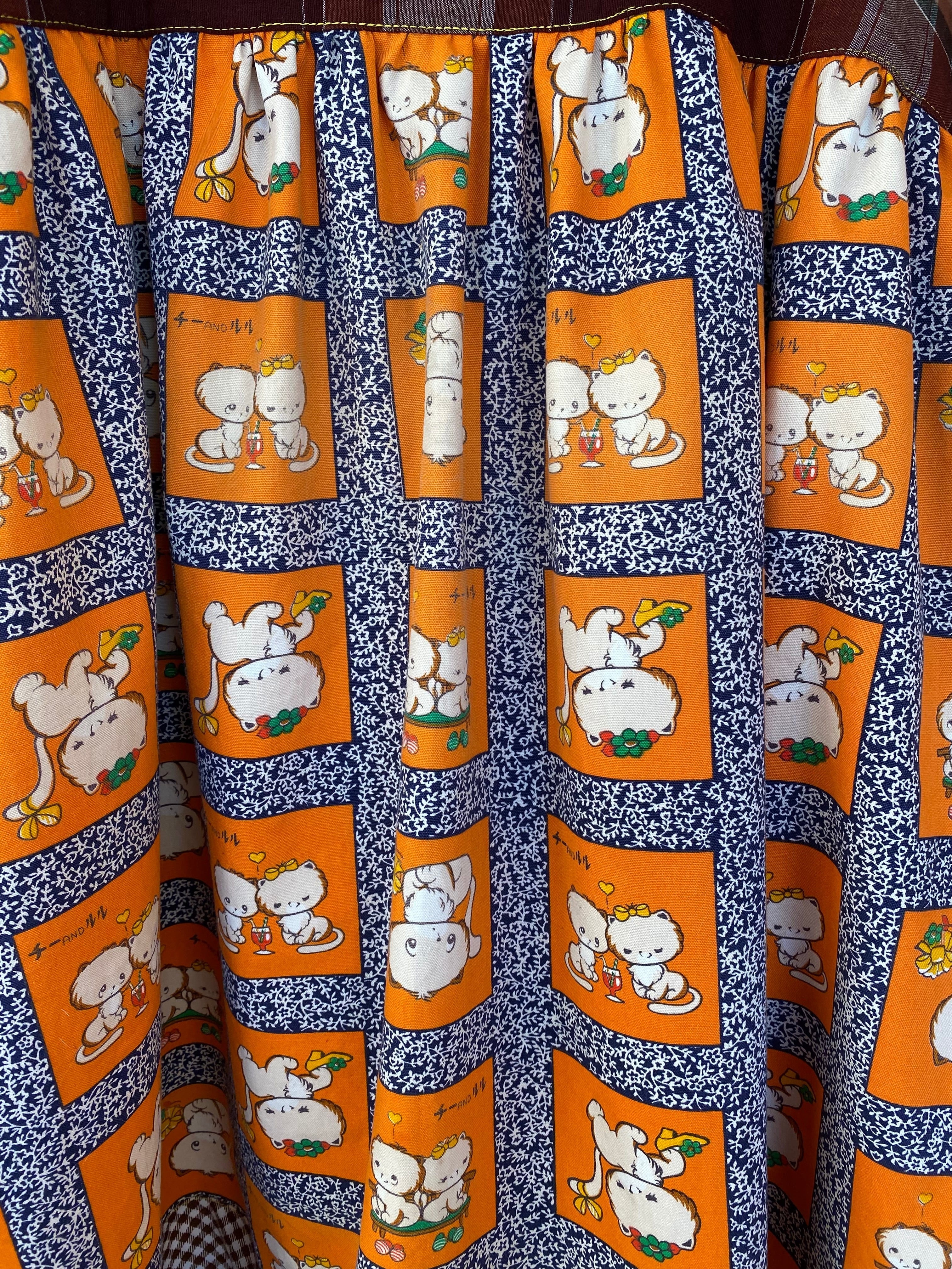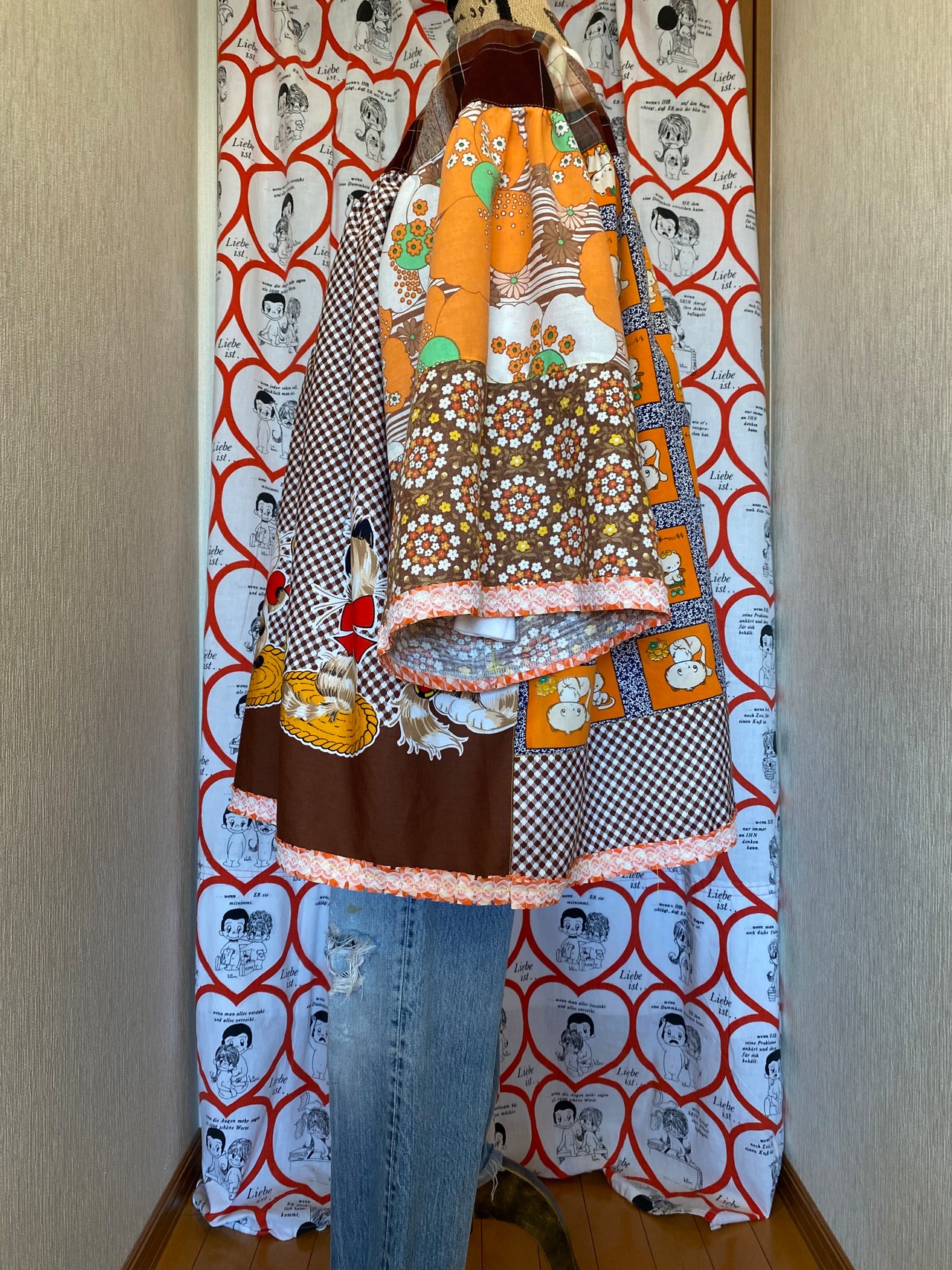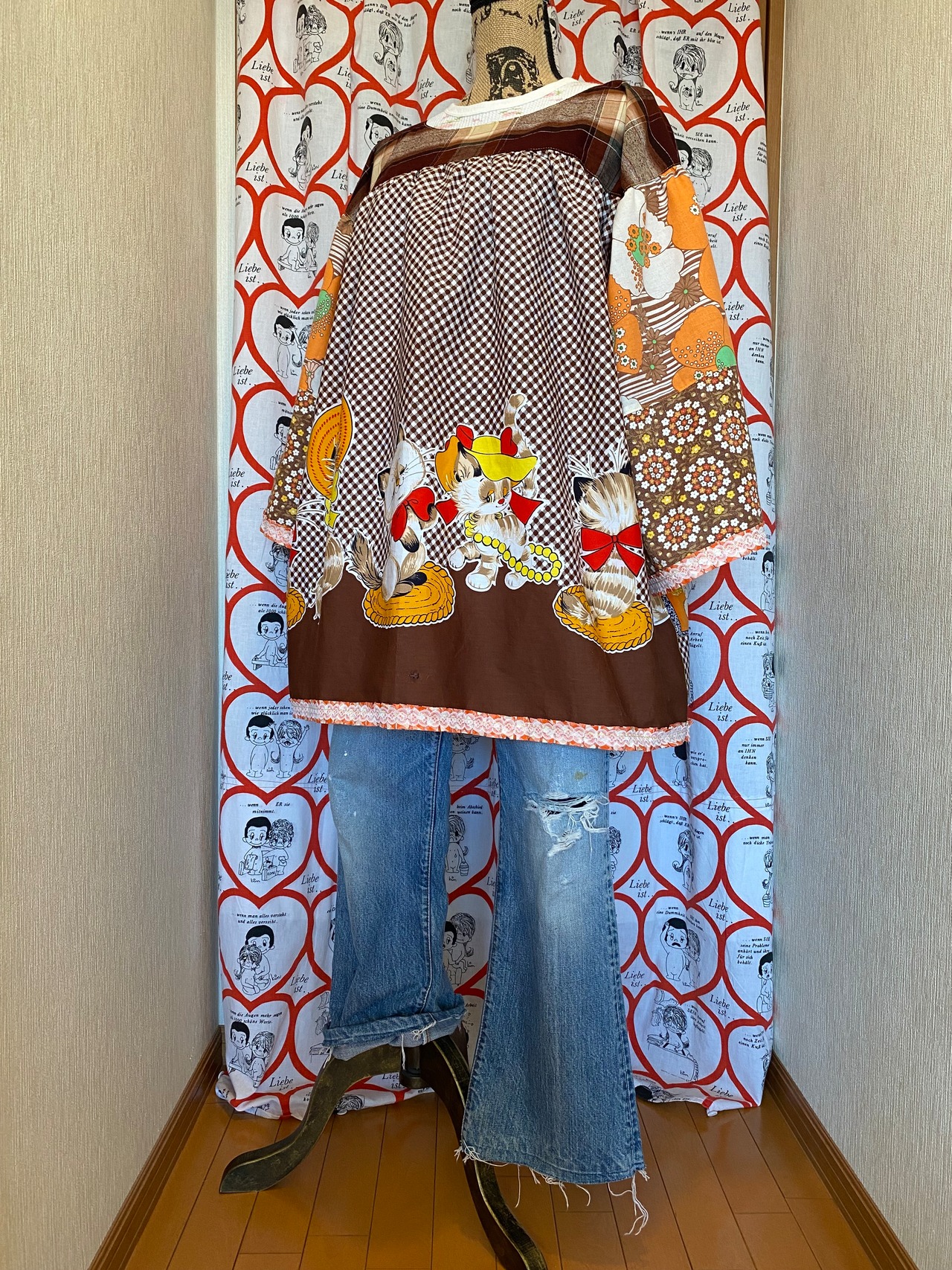 #Nyaoko#remake#fashion#handmade#upcycled #eshikar #sustainable#リメイク#ファッション#ハンドメイド#アップサイクル#エシカル#サスティナブル#昭和レトロ#布団皮#猫#花柄#レトロアニマル#レトロプリント#格子#ギンガムチェック#ファンシー#1970年代