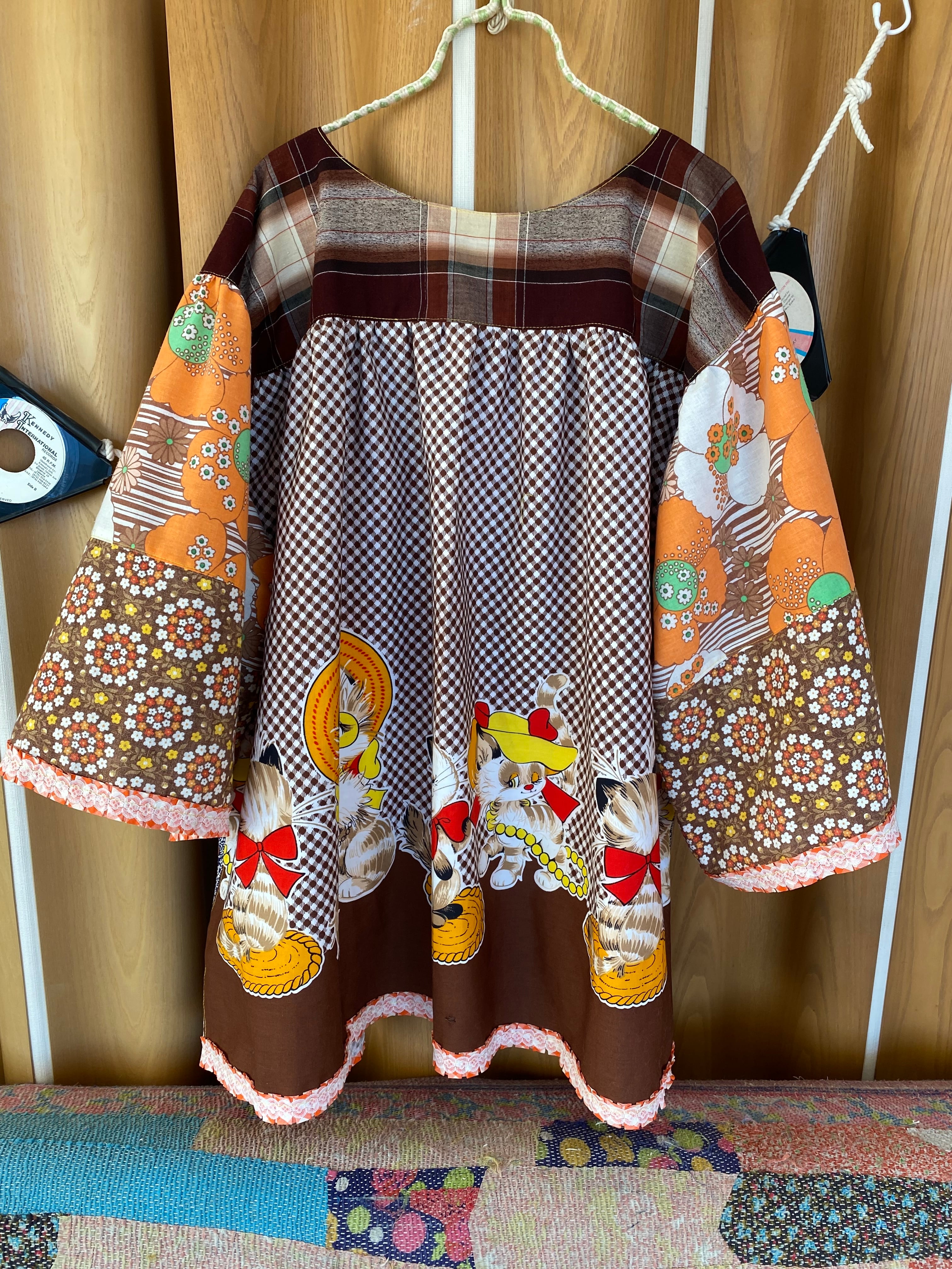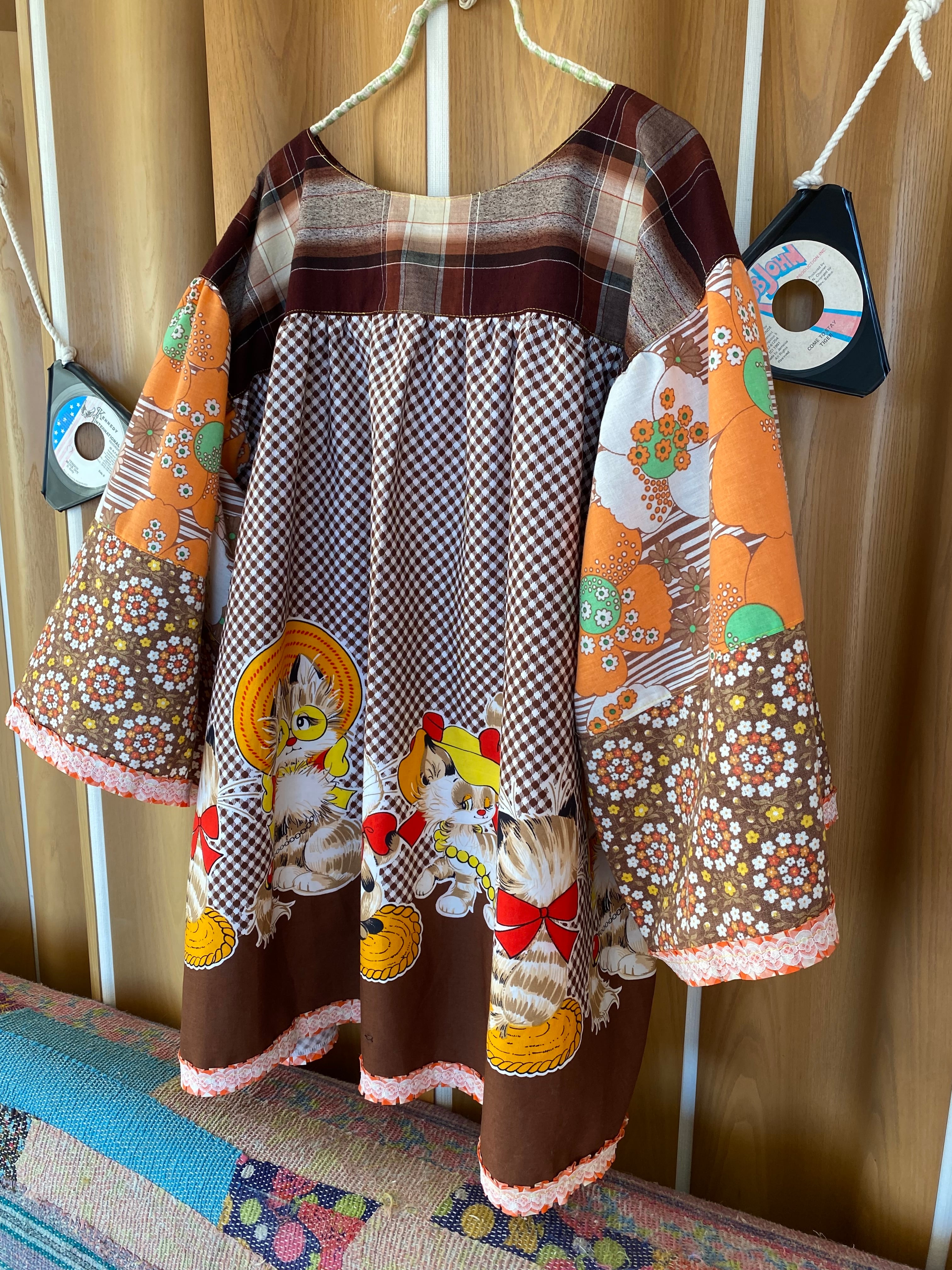 昭和レトロな猫ちゃんのパネル柄の生地を中心に、猫ちゃんの総柄生地やサイケデリックな花柄生地、小花柄生地、布団皮格子を使ってゆったりとした1970年代風のチュニックを作りました。