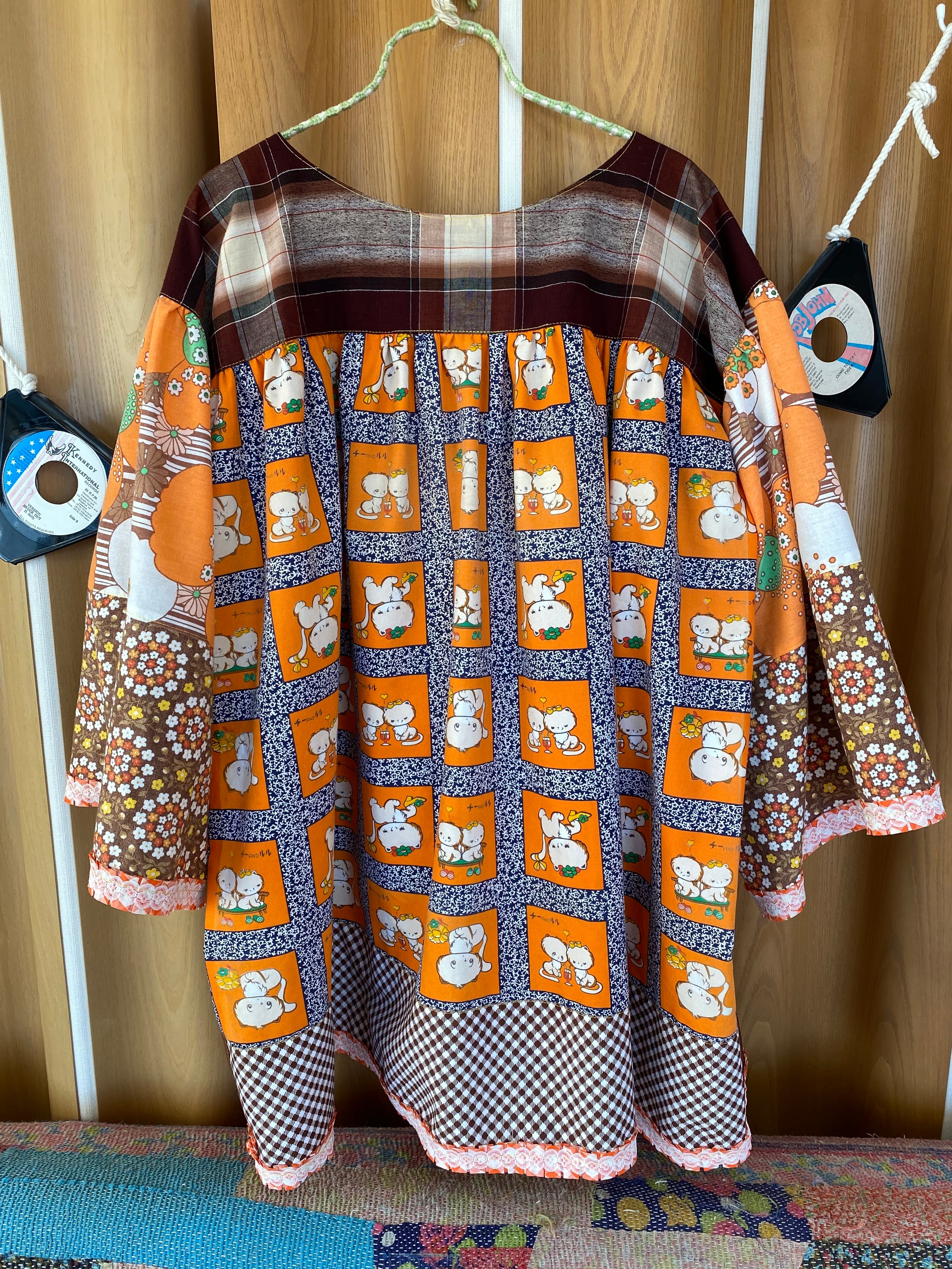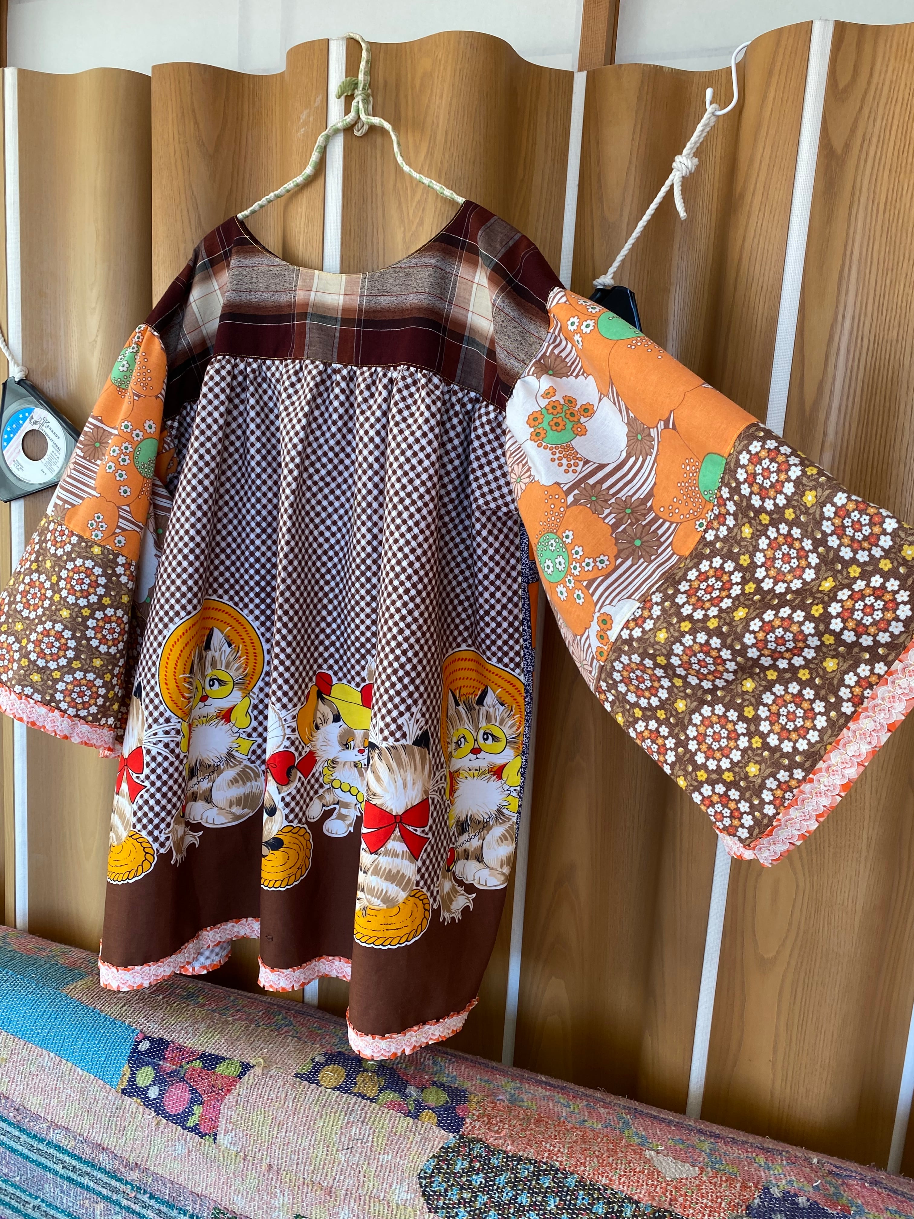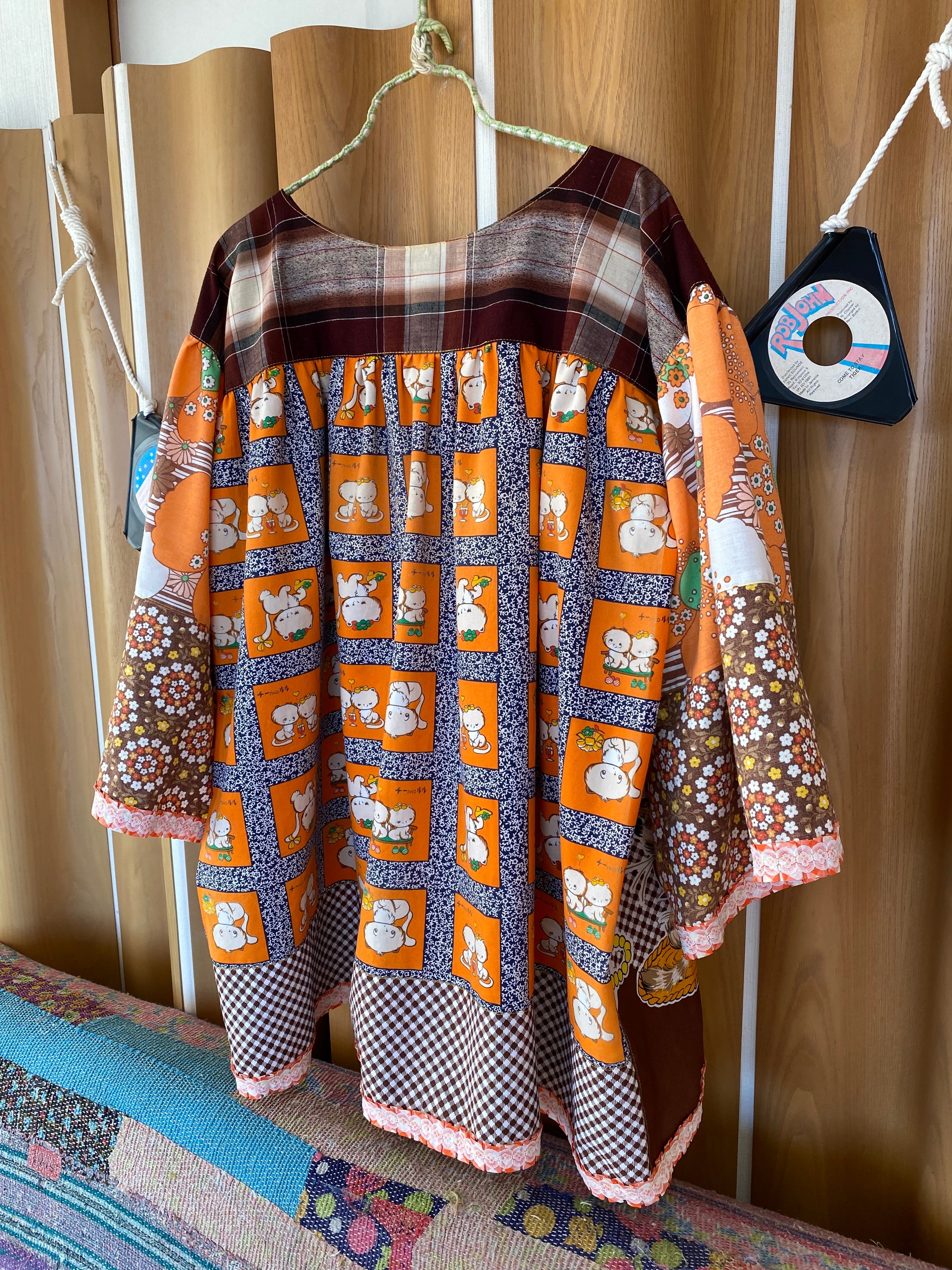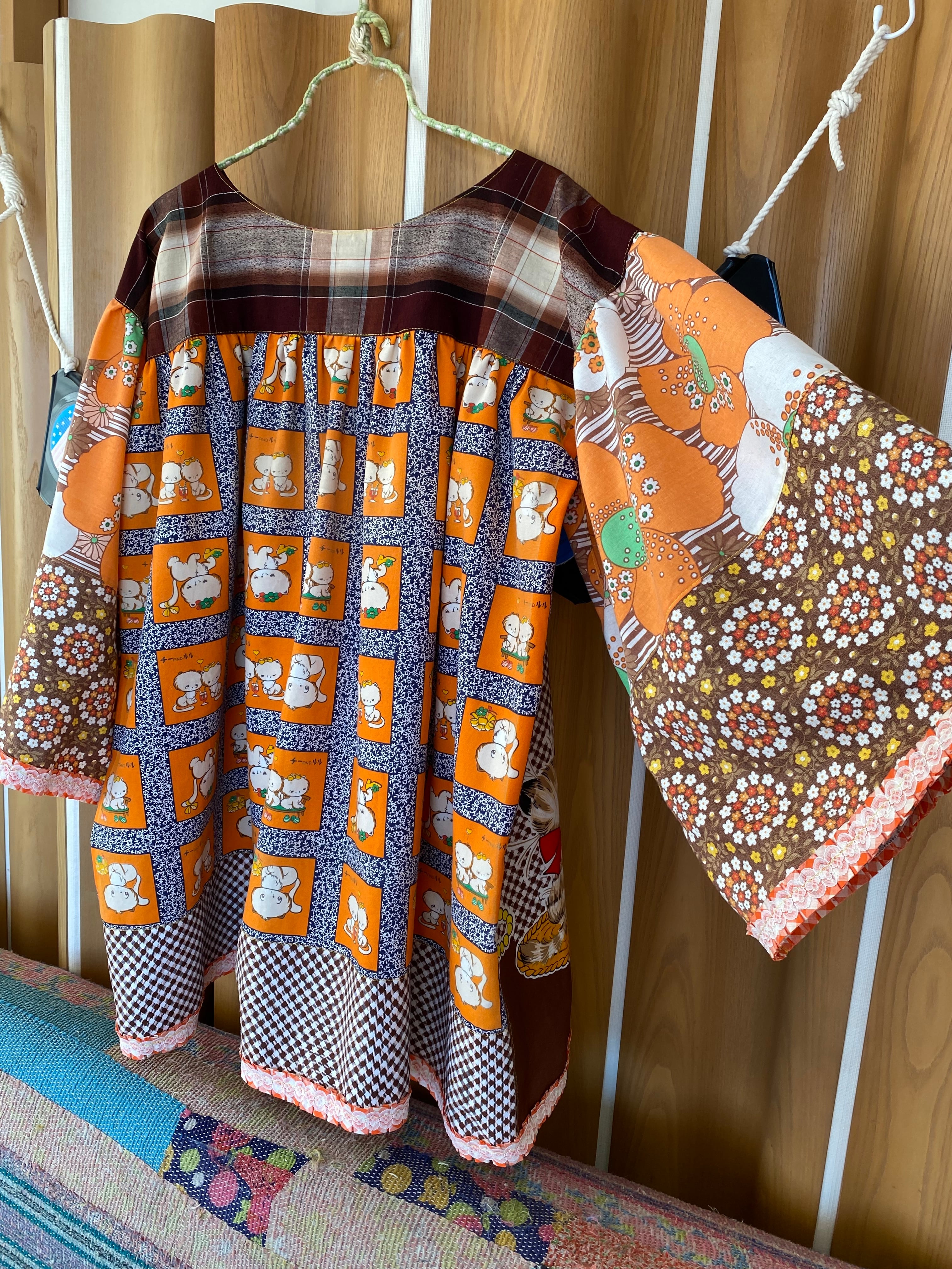 I created a loose-fitting 1970s-style tunic using fabrics featuring a retro Showa-era cat panel pattern, as well as all-over cat print fabrics, psychedelic floral prints, small floral prints, and duvet cover plaid.