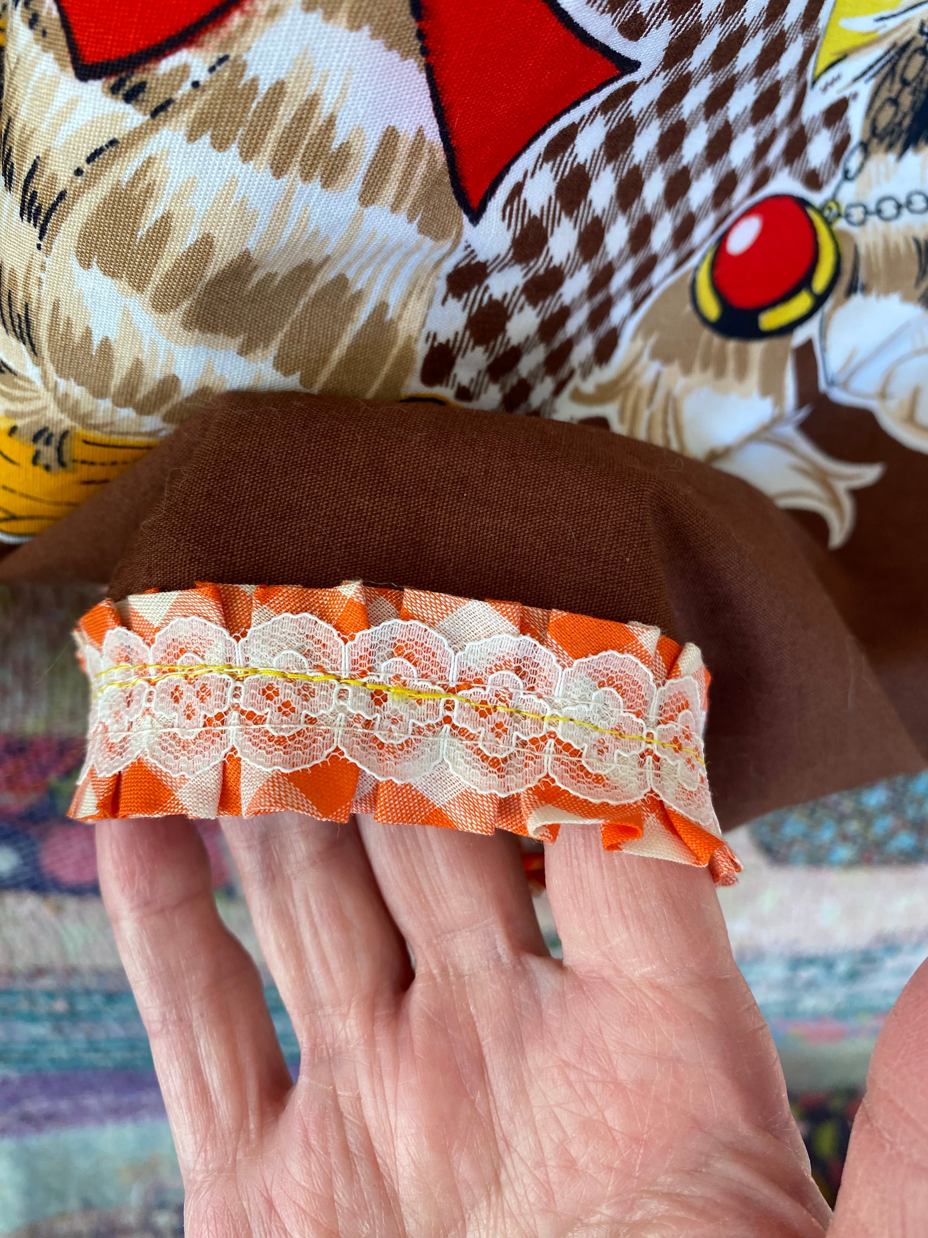 アクセントに裾と袖口にギンガムチェックとレースのブレードを縫い付けました。