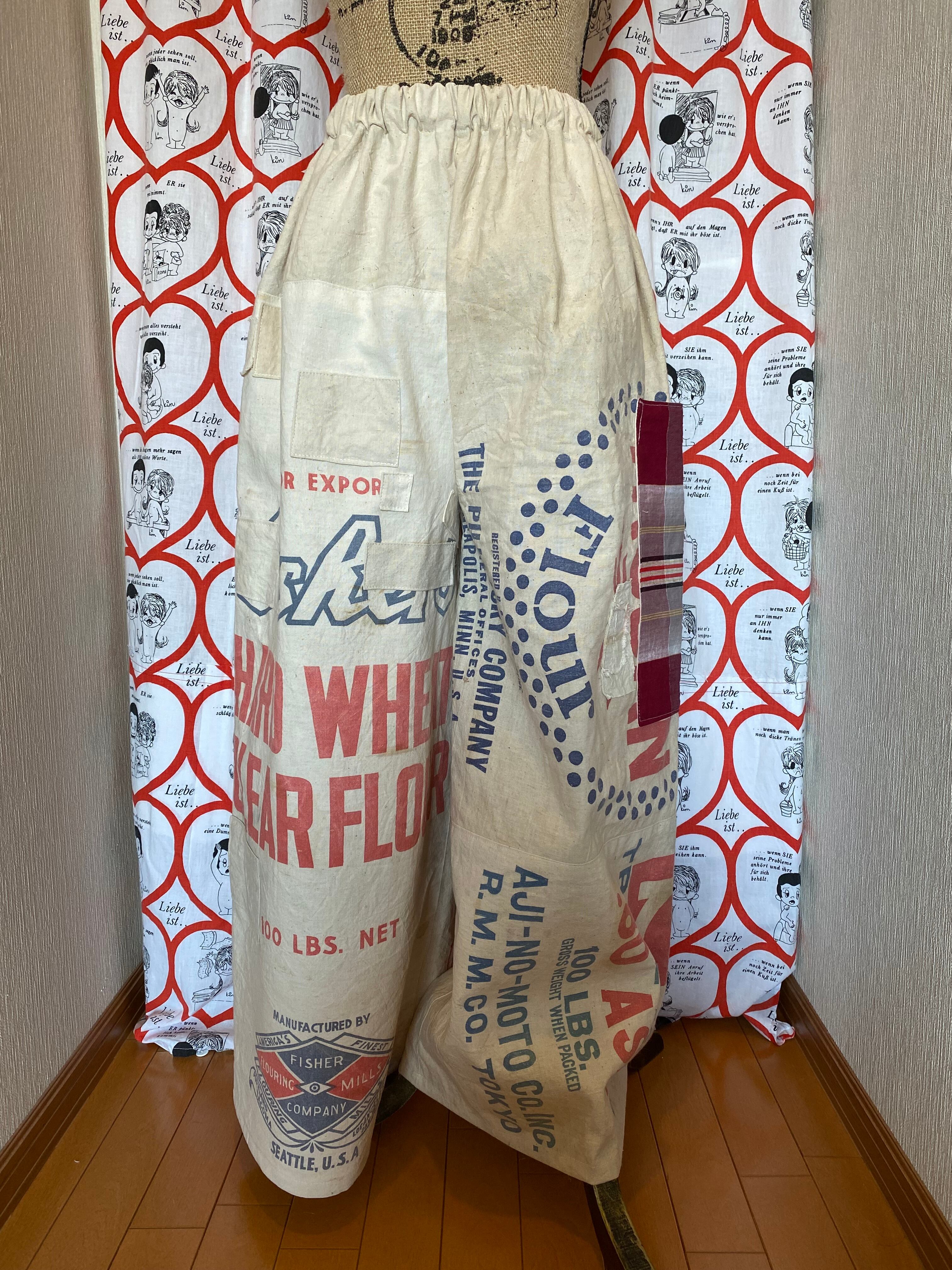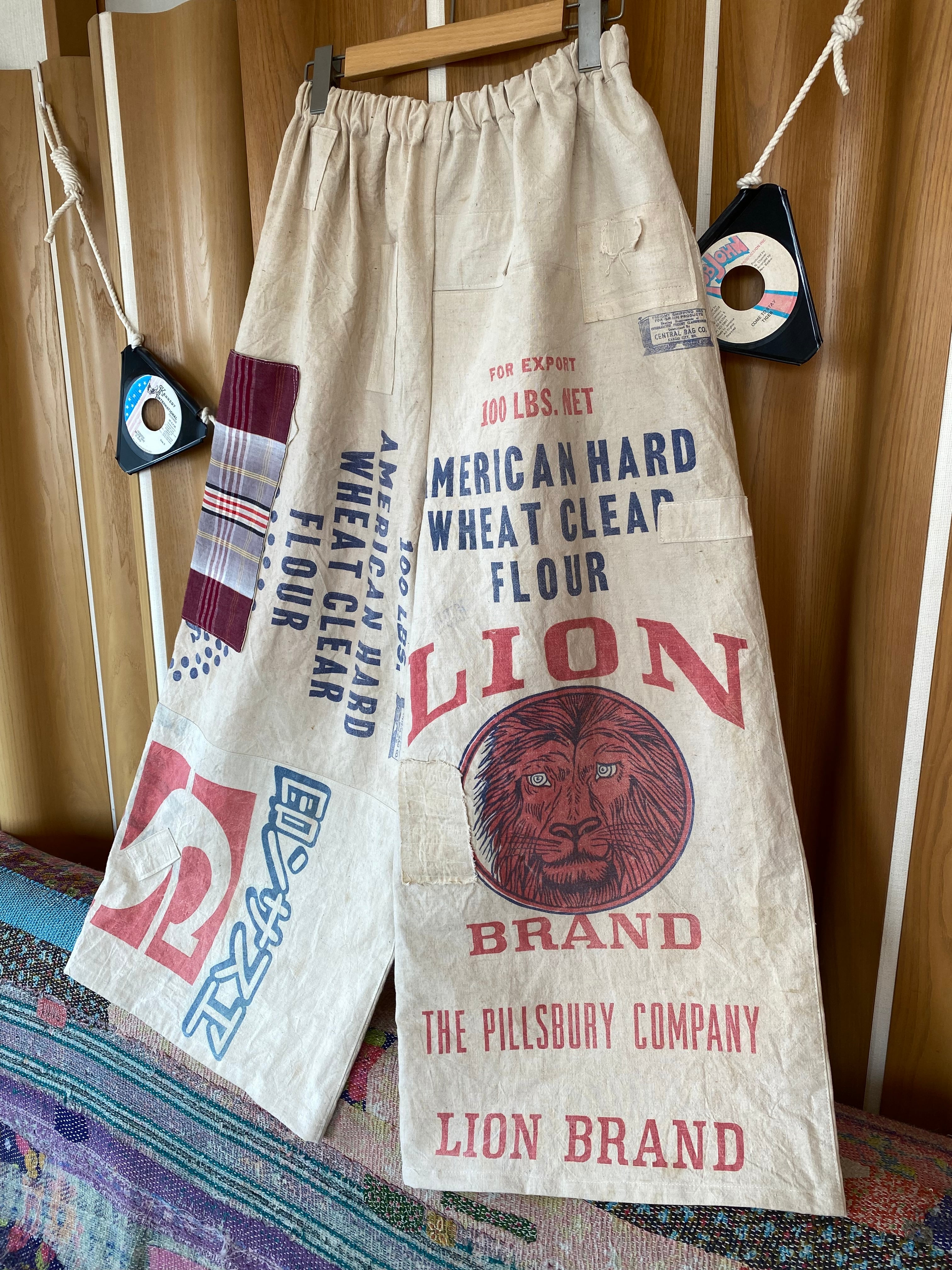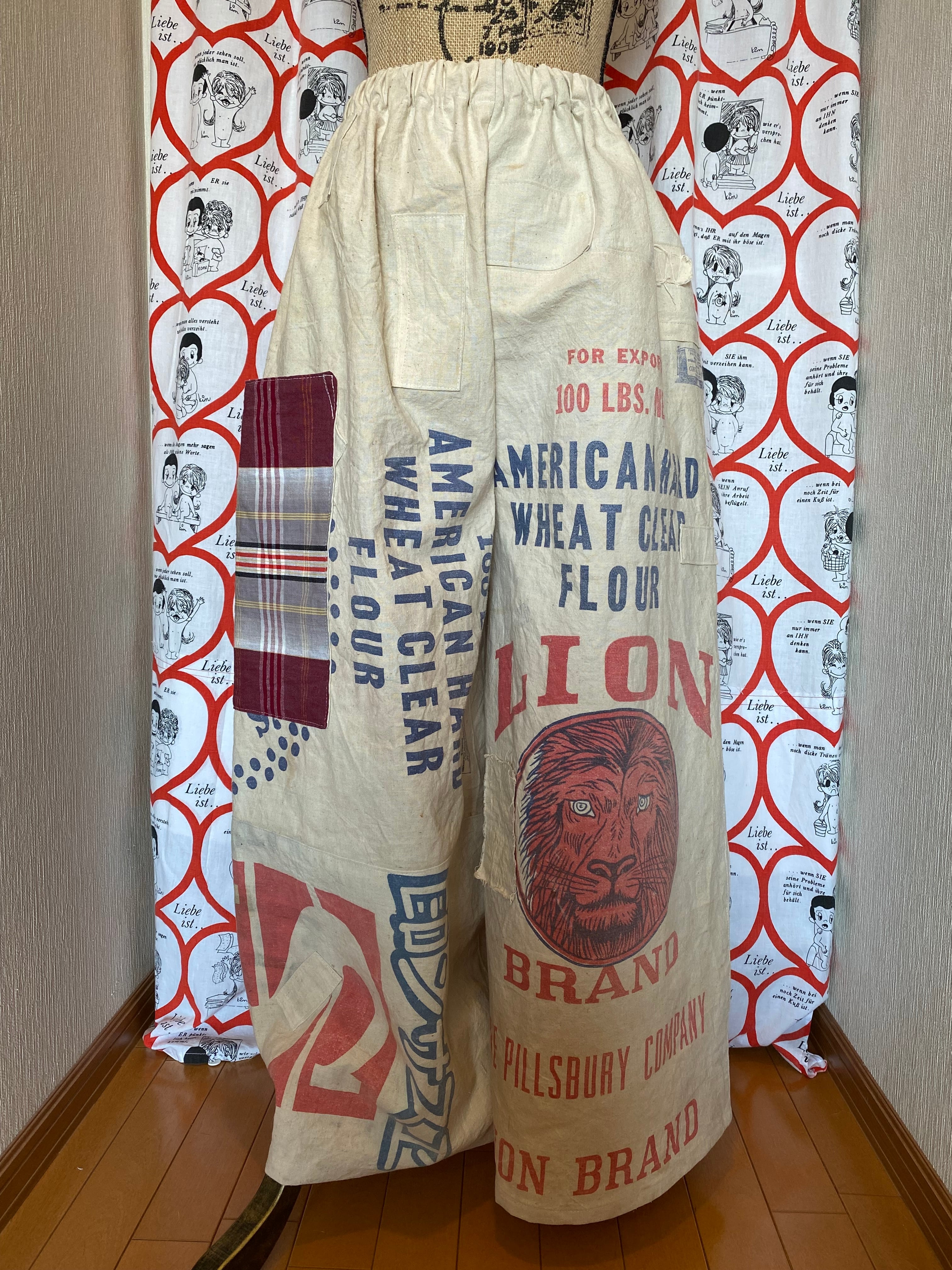 使い古された、なかなか手に入らないライオンの粉袋や使い古されたいろいろな粉袋を使ってワイドパンツを作りました。