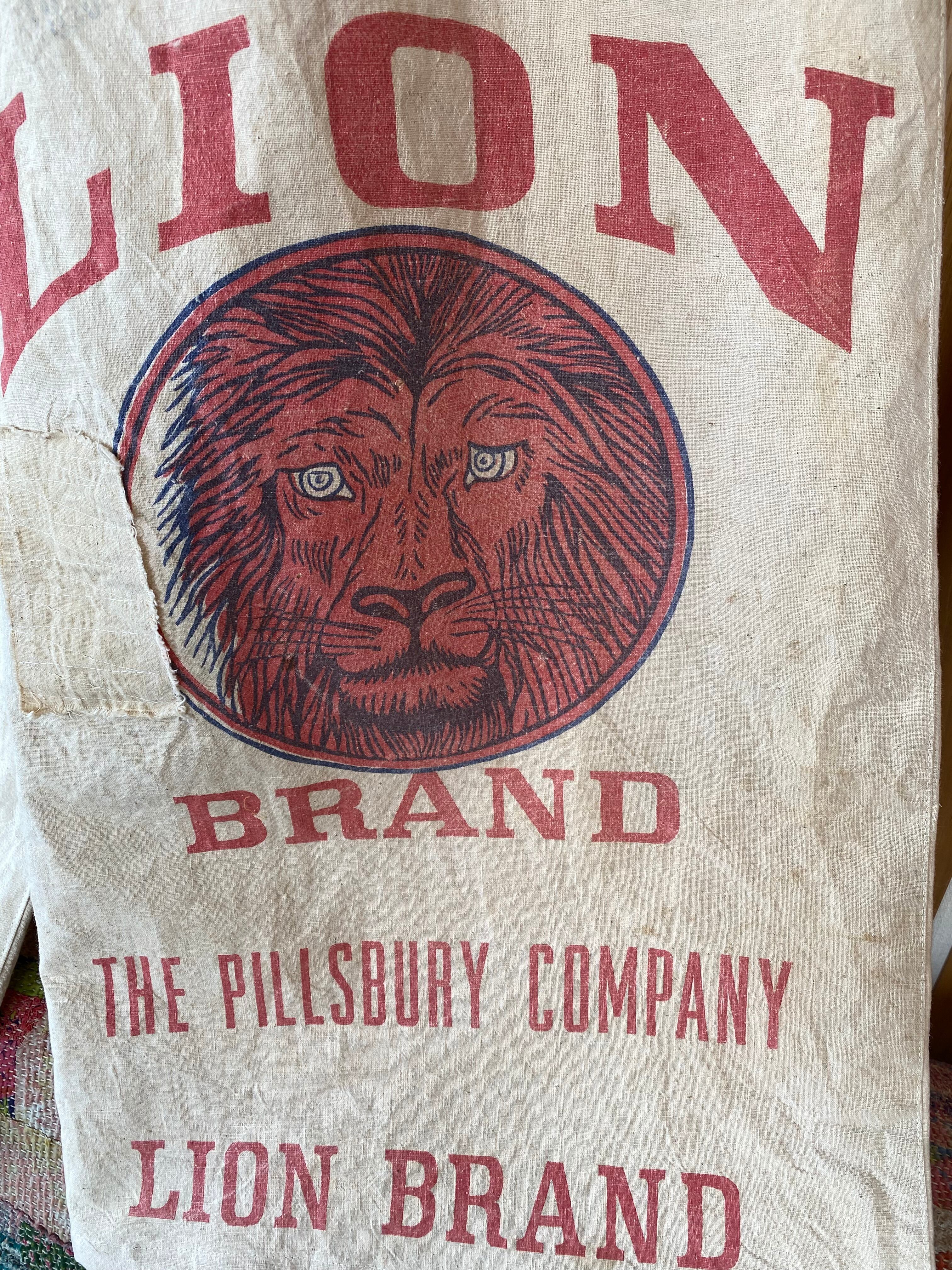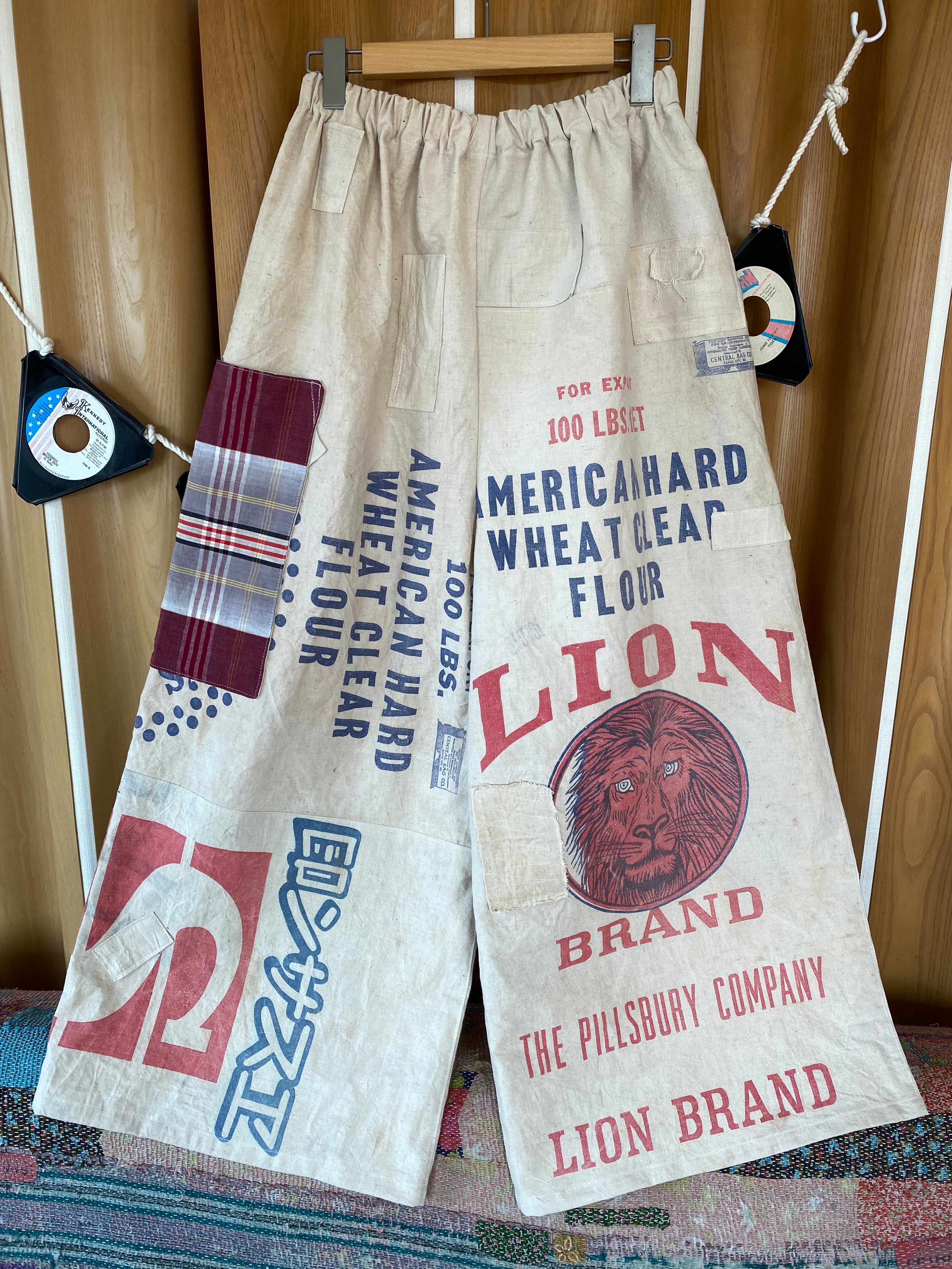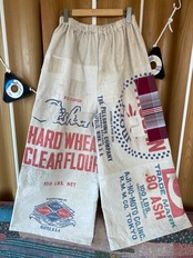 I made these wide-leg pants using a hard-to-find Lion flour sack and various other used flour sacks.