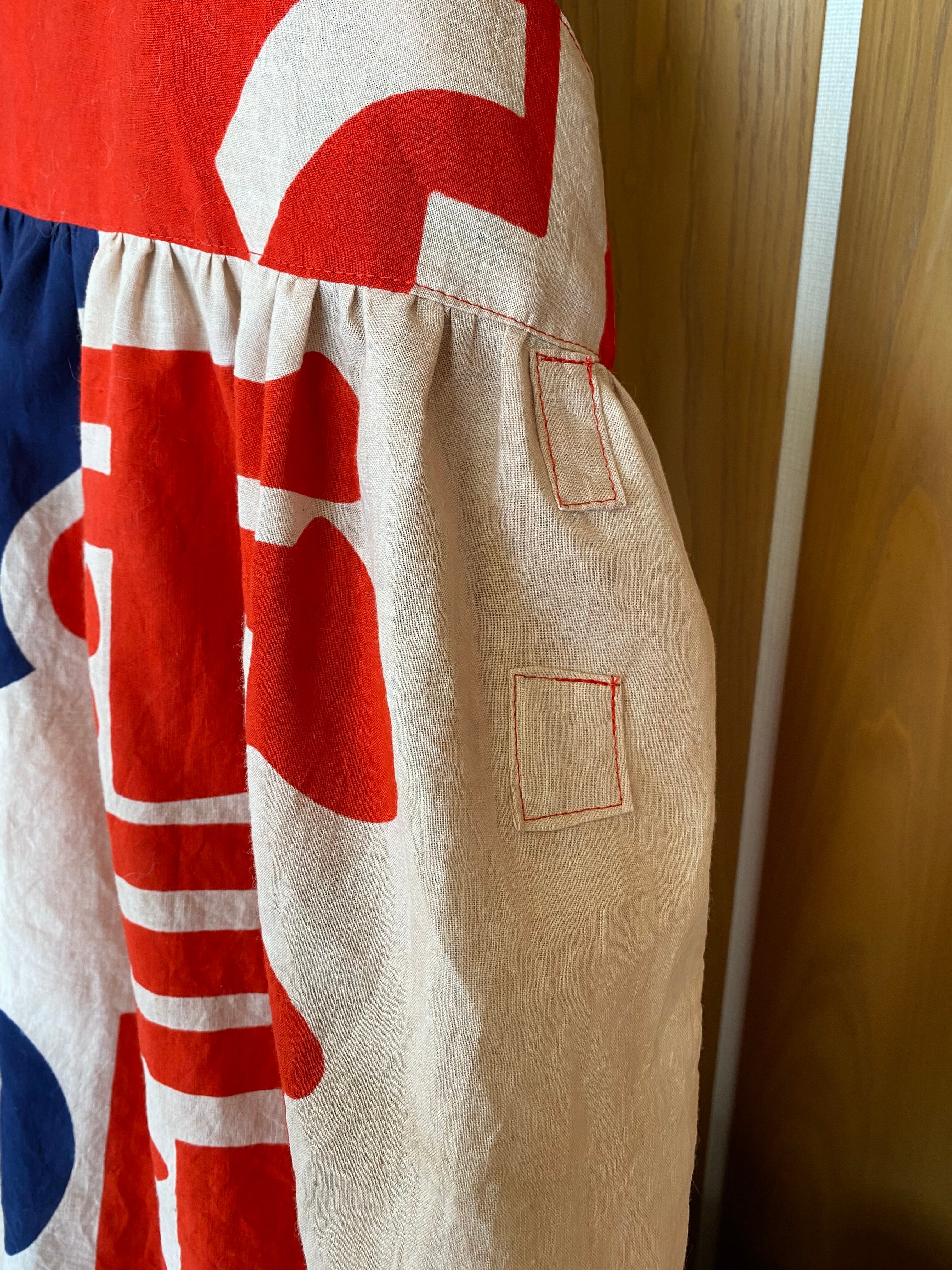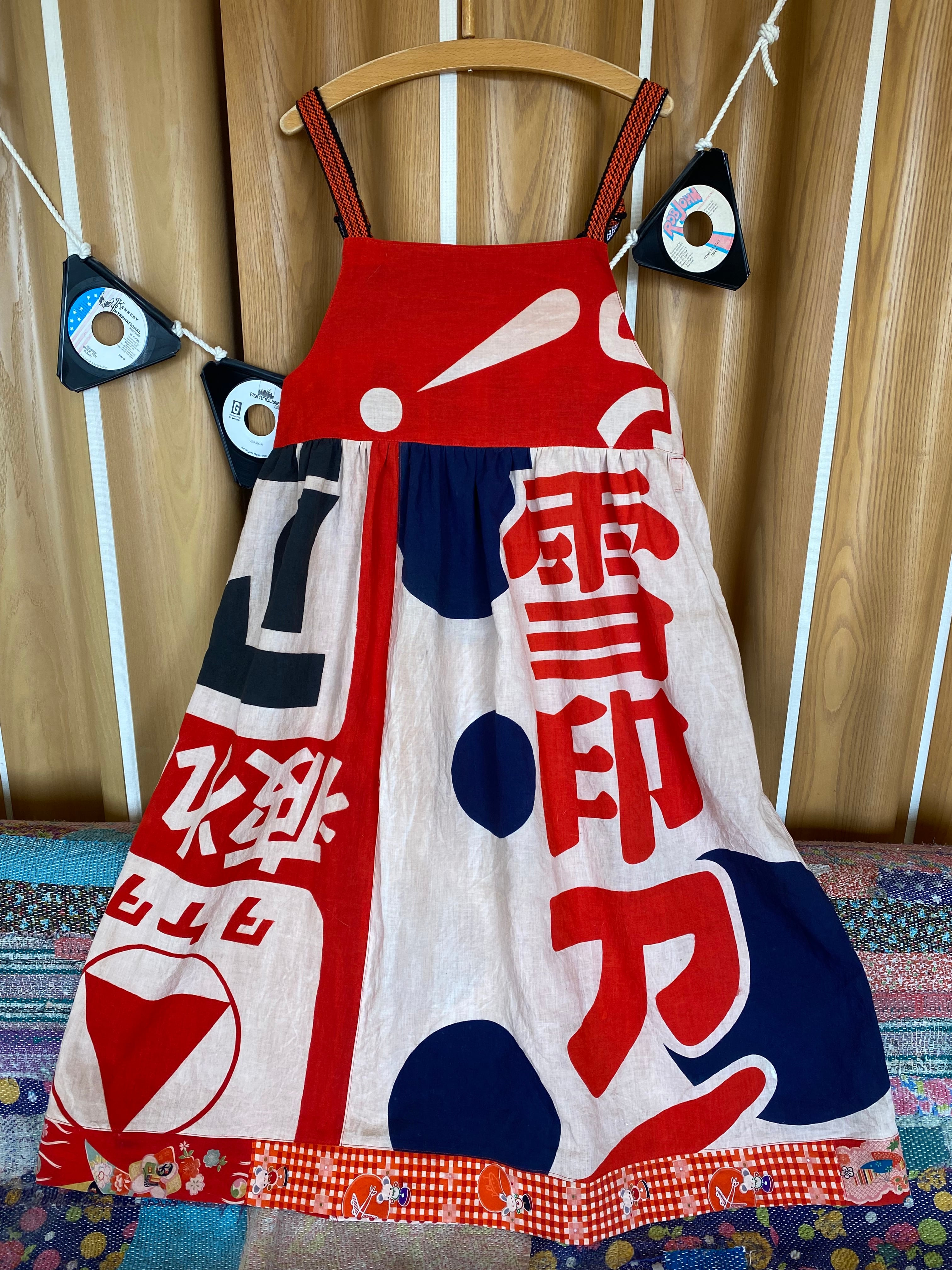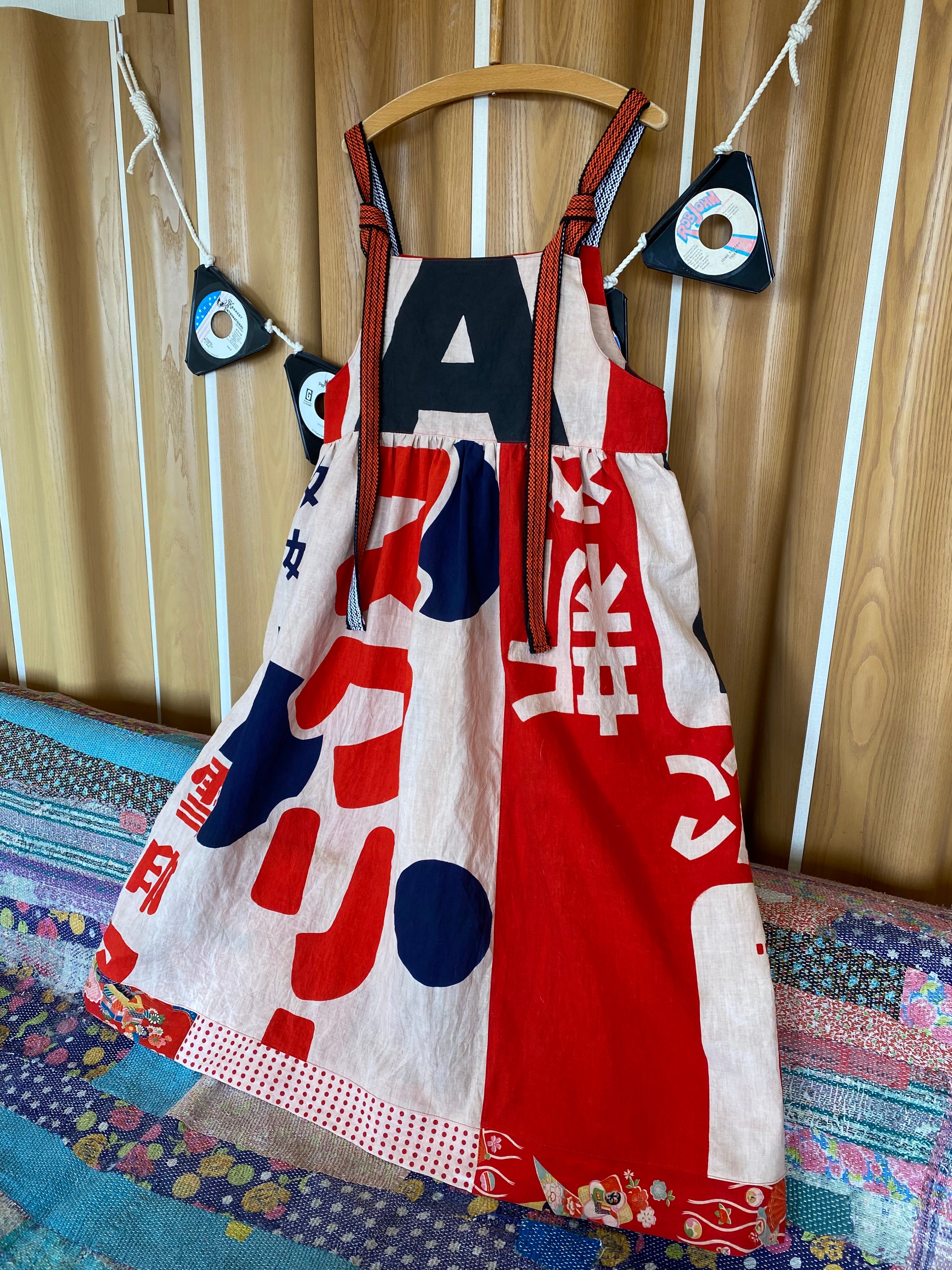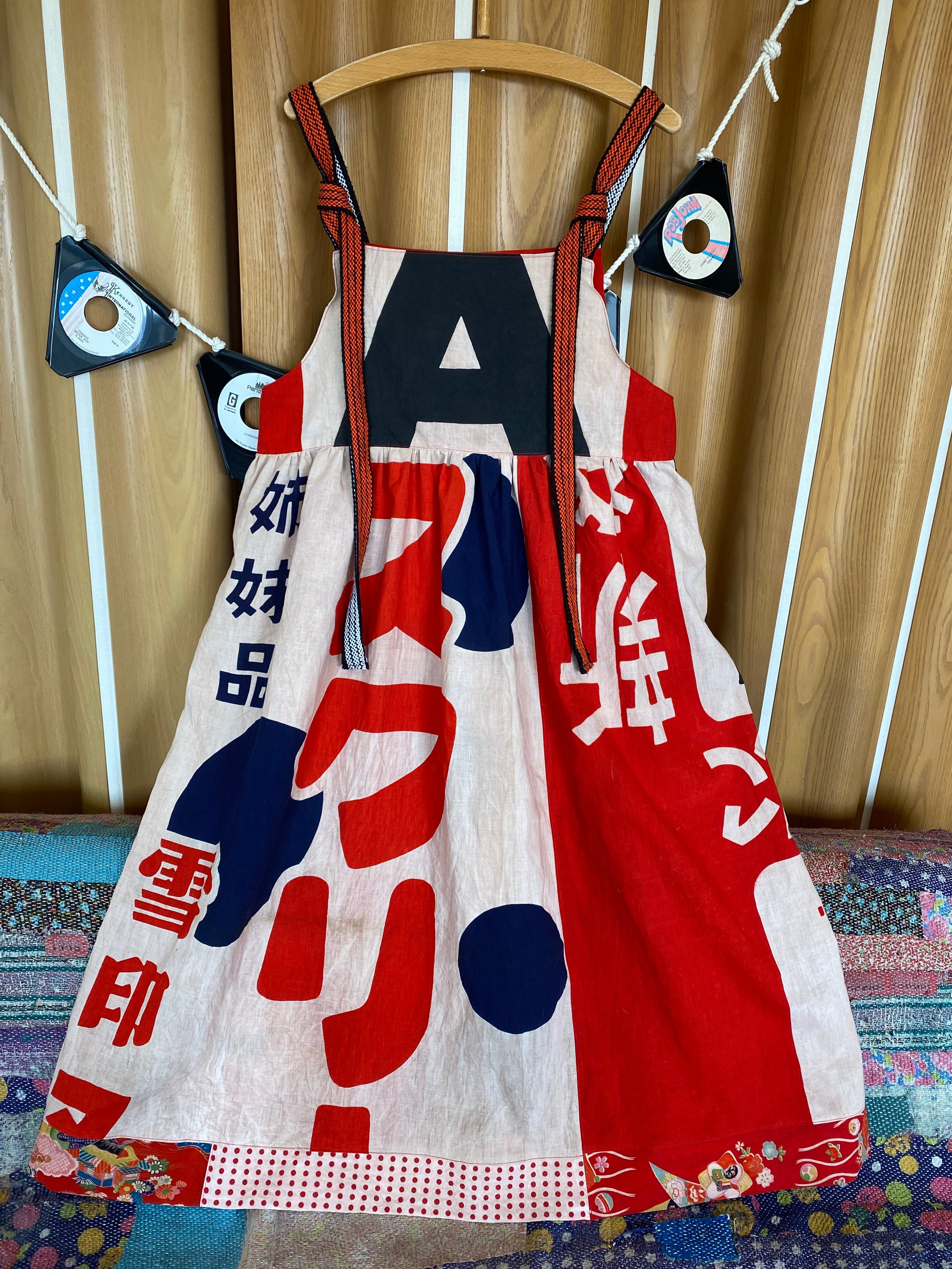 昭和時代の雪印アイスクリームの広告旗とアリナミンAの広告旗、子供用着物生地、水玉手ぬぐいを柿渋染めして、ゆったりとしたジャンドレワンピースを作りました。