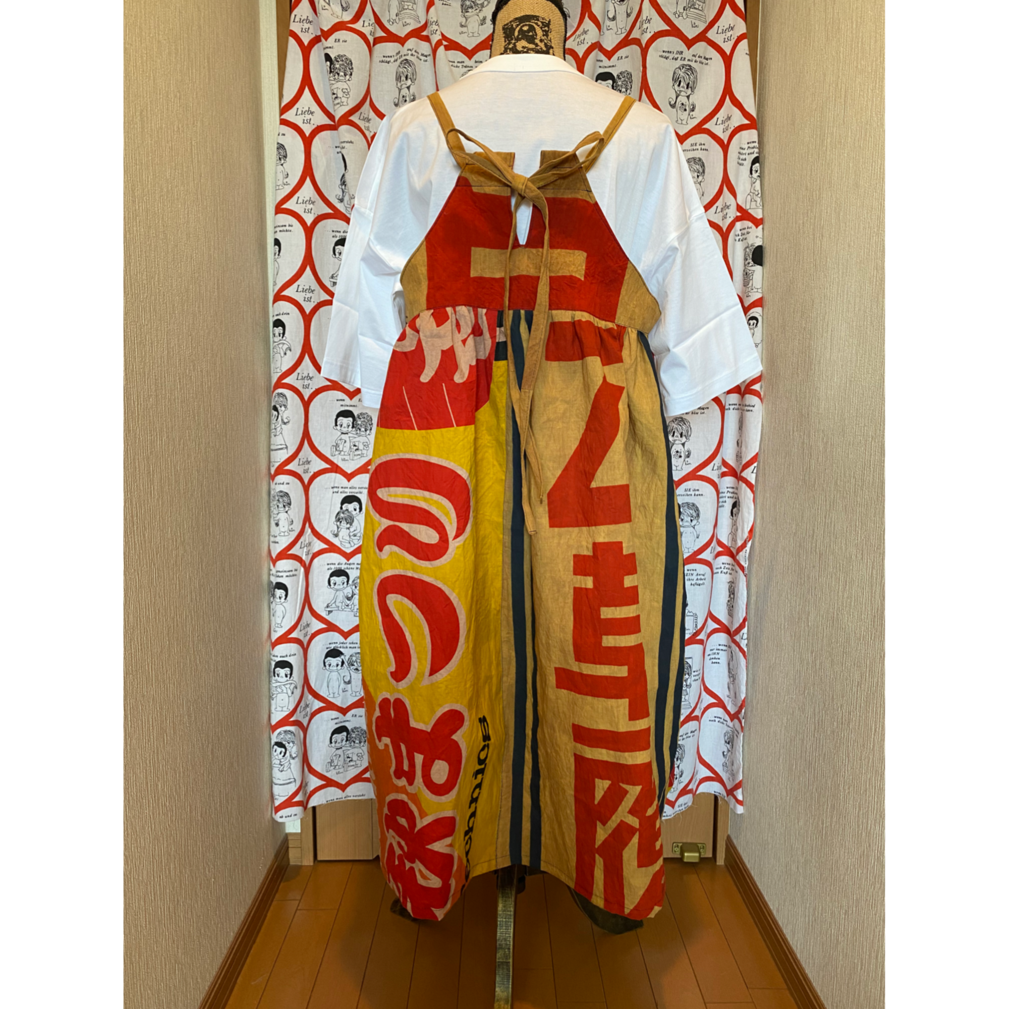 リメイク 昭和レトロ広告旗柿渋染めリメイクリボンジャンドレ