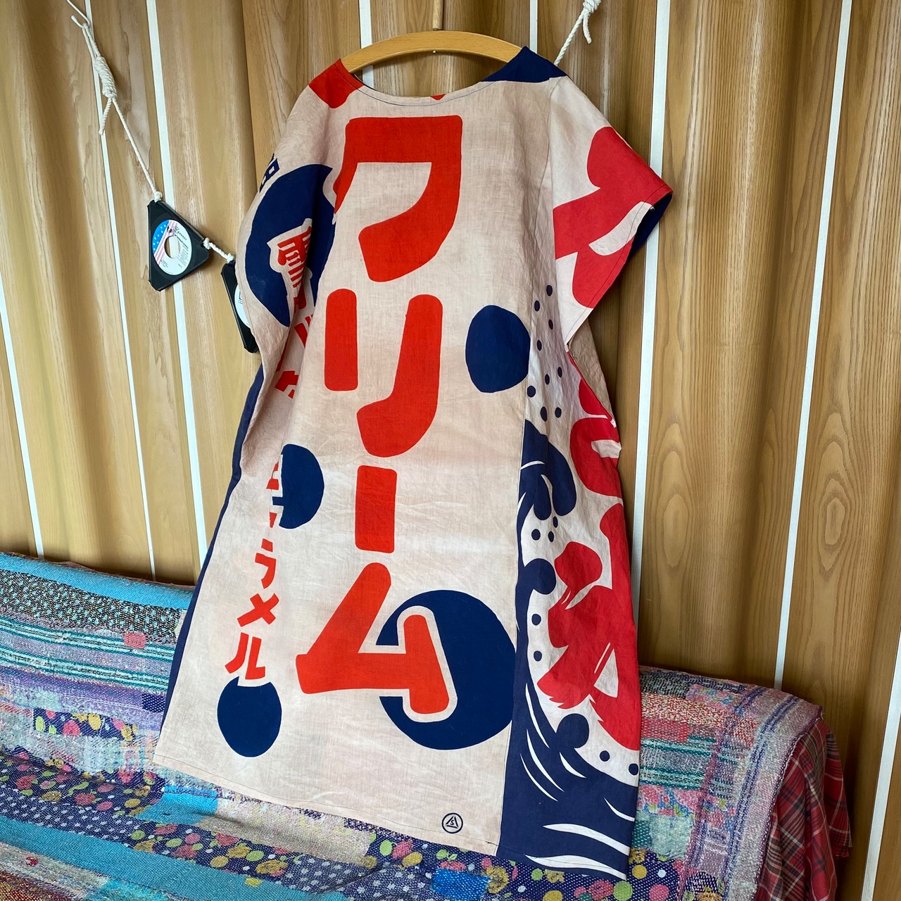 かき氷の広告旗を柿渋で染めて、着やすいストンとしたロングワンピースを作りました。