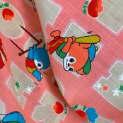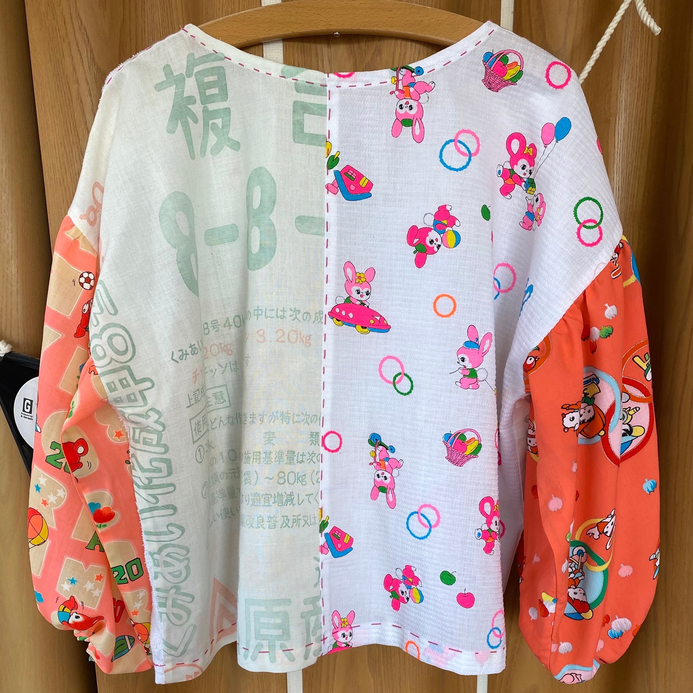 1960年代〜1970年代の温泉タオルと粉袋、子供着物地、浴衣地を組み合わせたプルオーバーブラウスを作りました。