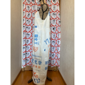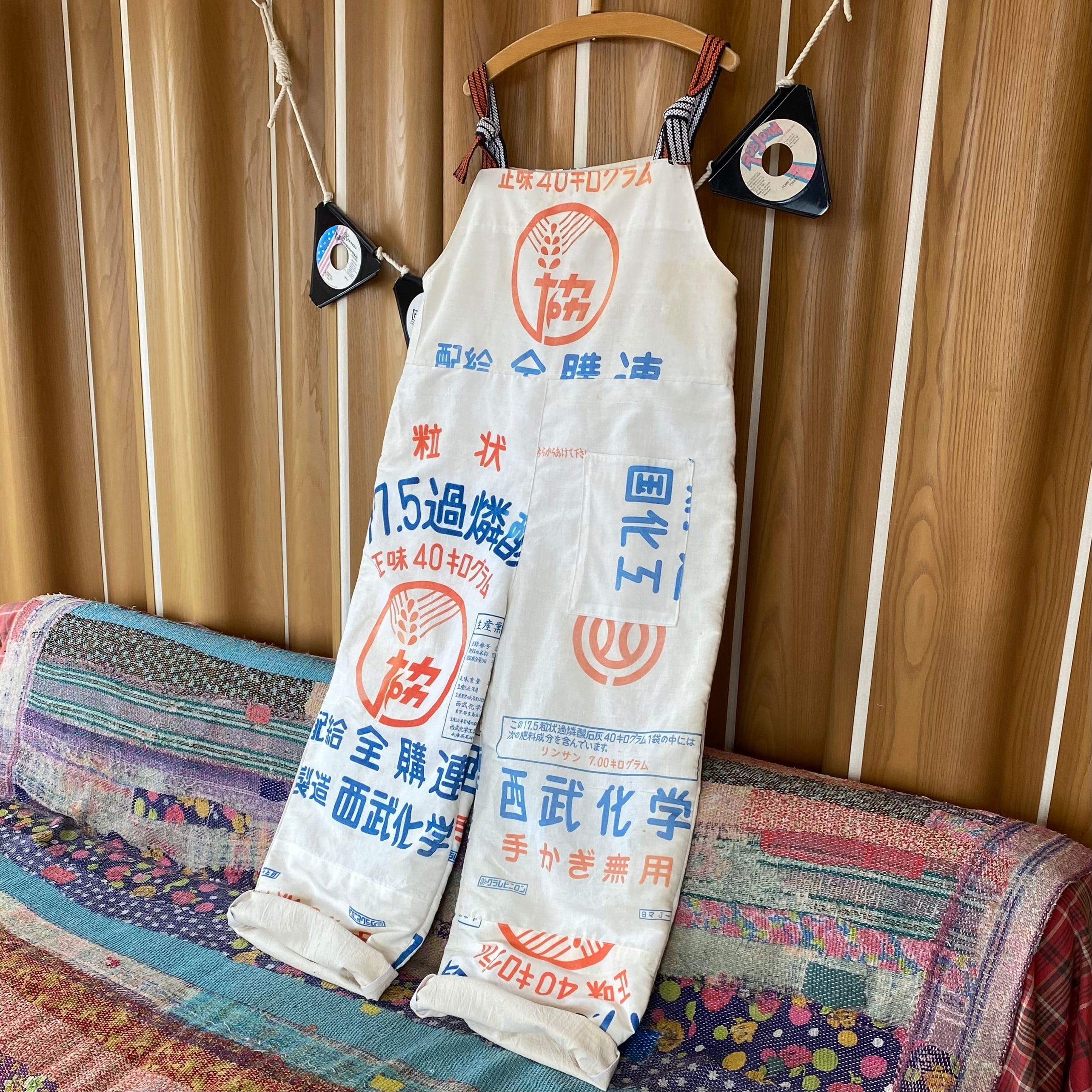 昭和40年頃の農協の粉袋(肥料袋)をたくさん使ってオーバーサイズのサロペットパンツを作りました。