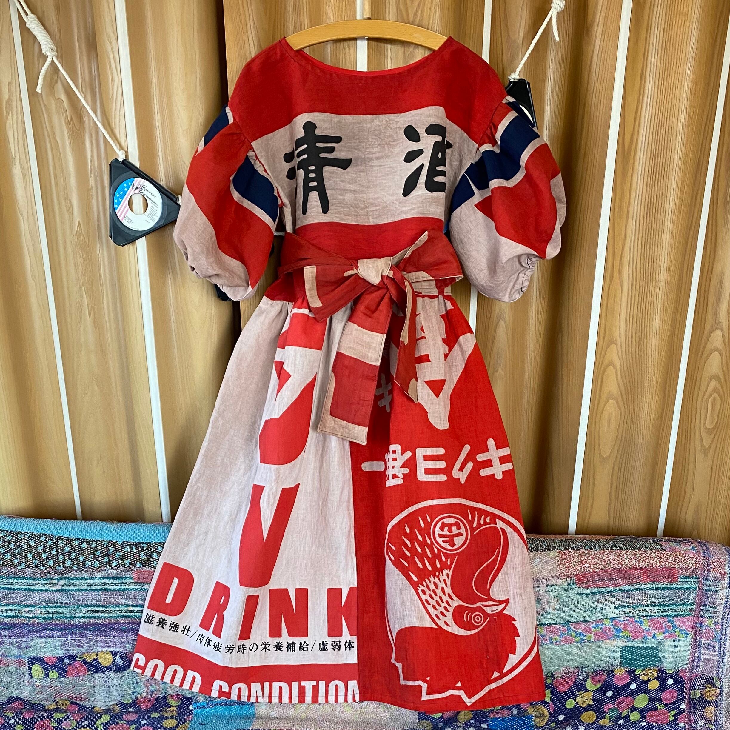 I made a puff sleeve dress with a ribbon belt by dyeing various advertising flags of the Showa period with persimmon tannin.
