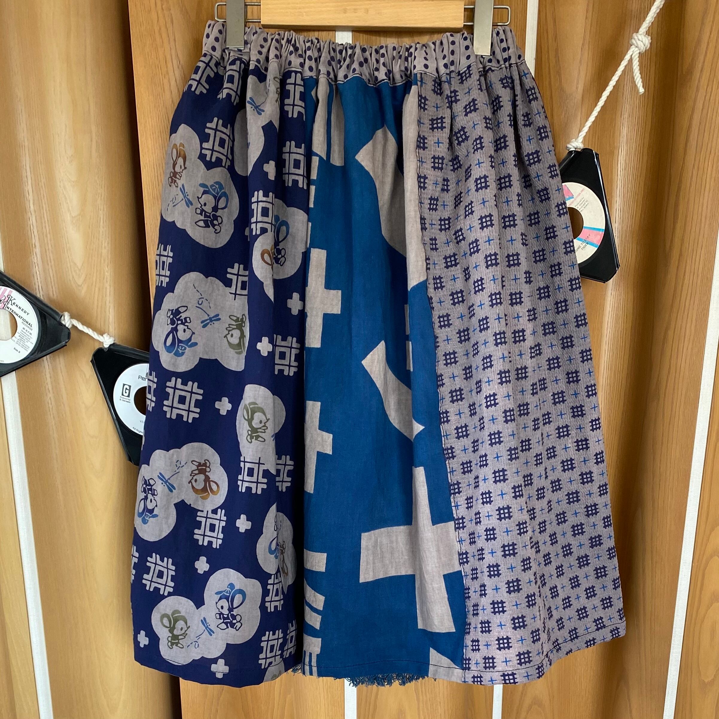 I made a gathered skirt by combining an apron worn in the early Showa era that has become a nice color, persimmon tannin dyeing, iron mordant yukata fabric for children in the Showa retro 1960s, and advertising flags.