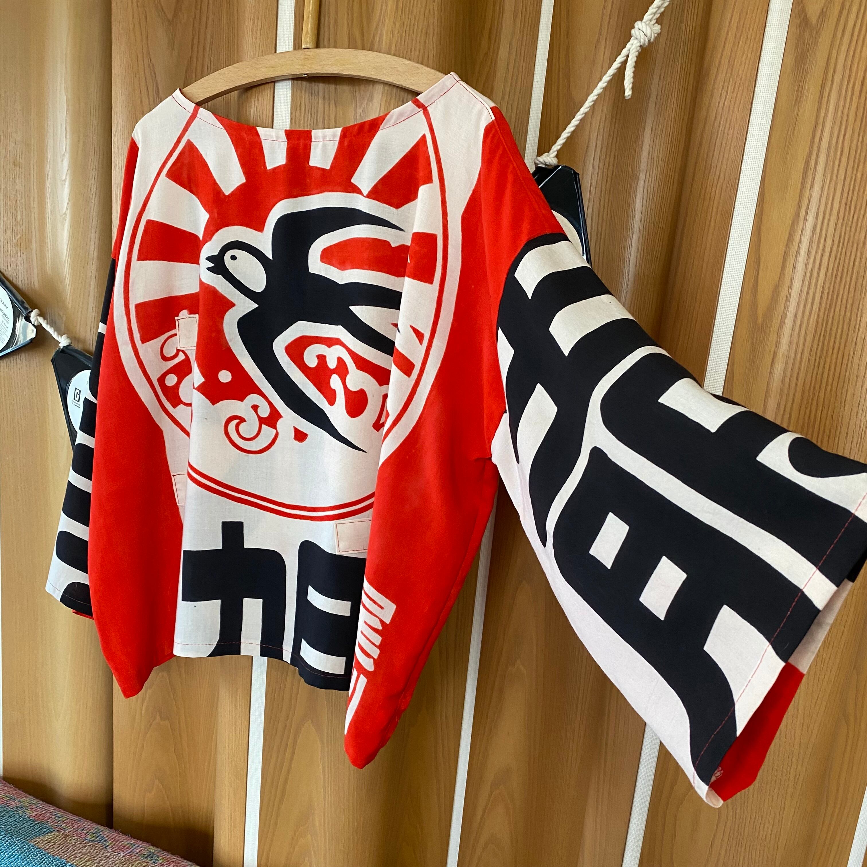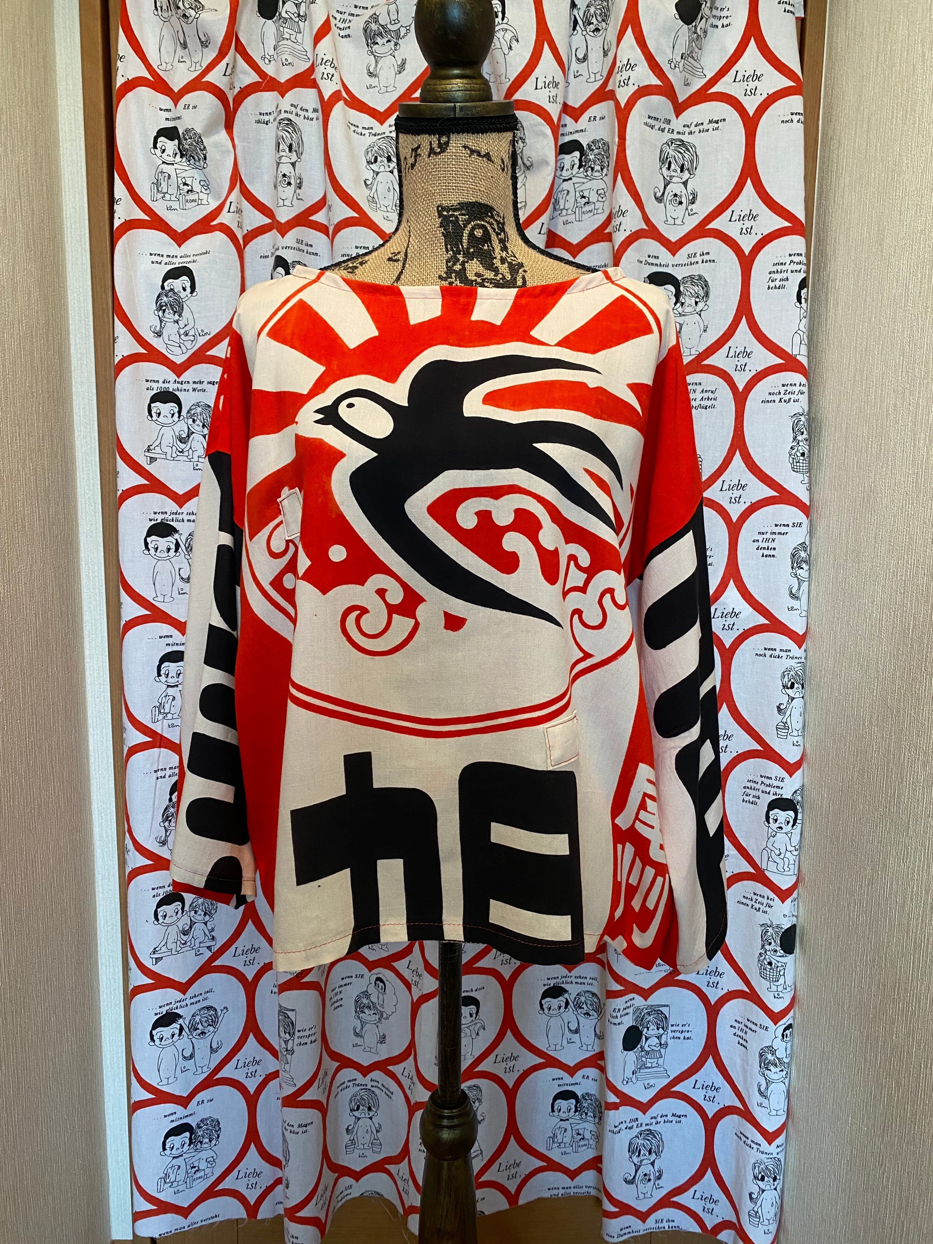 I made a loose long-sleeved blouse using the Asahi Tsubame school uniform advertising flag from the Showa era.