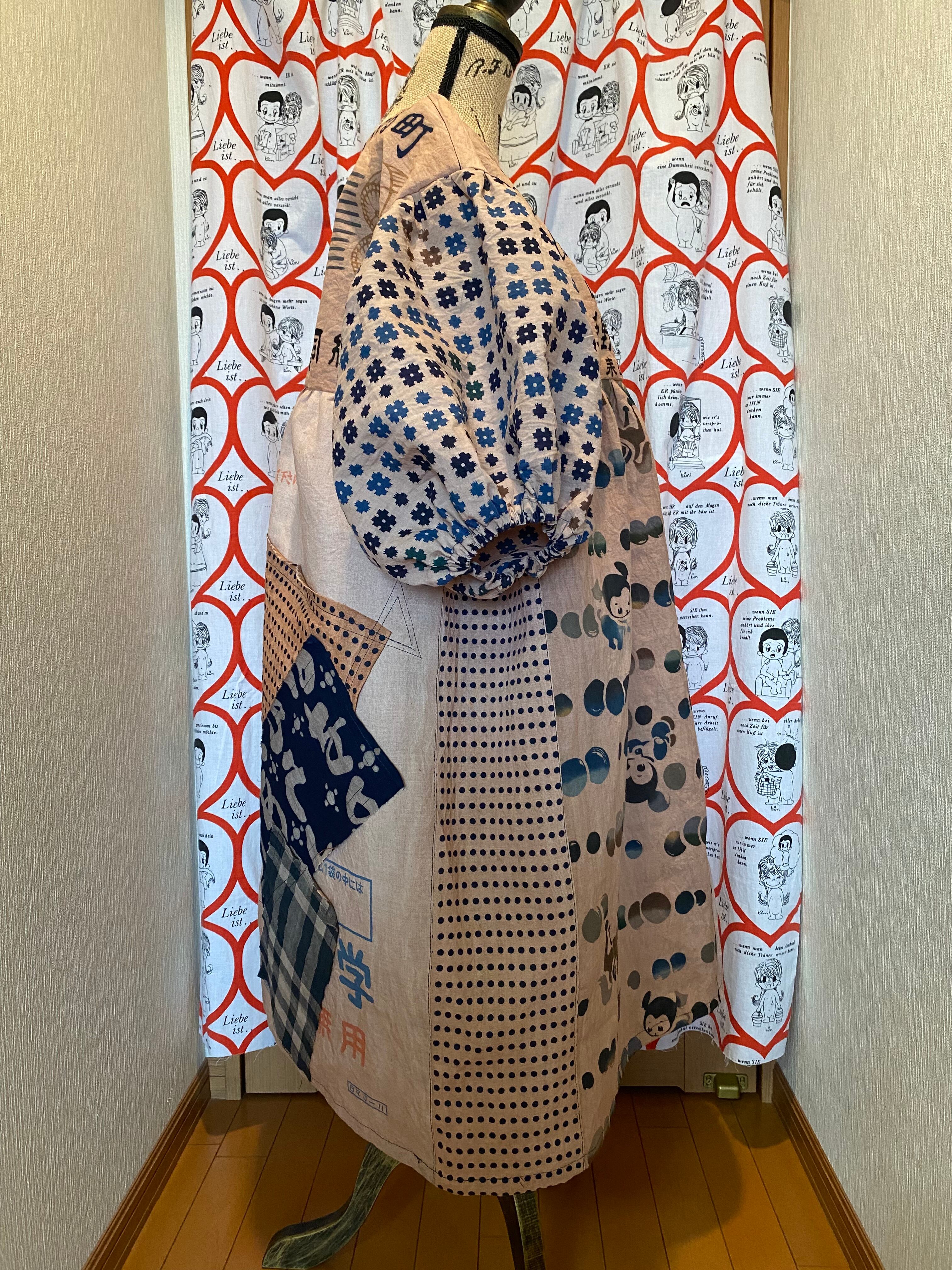 I made a dress with voluminous sleeves by dyeing 1960s Showa retro tenugui, children's yukata fabric, and powder bags with persimmon tannin.