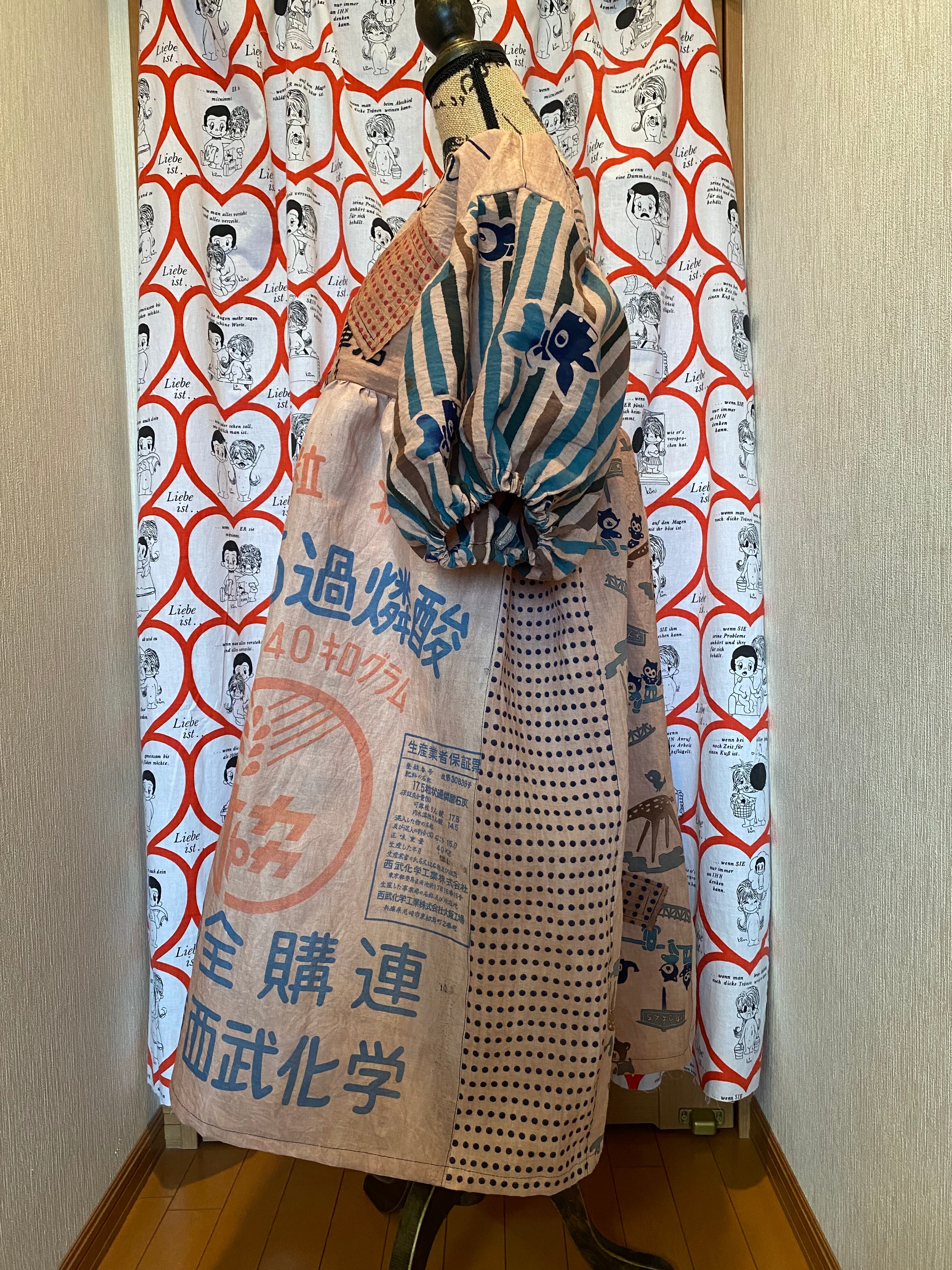リメイク 昭和レトロ手ぬぐい浴衣粉袋柿渋染めリメイクワンピース
