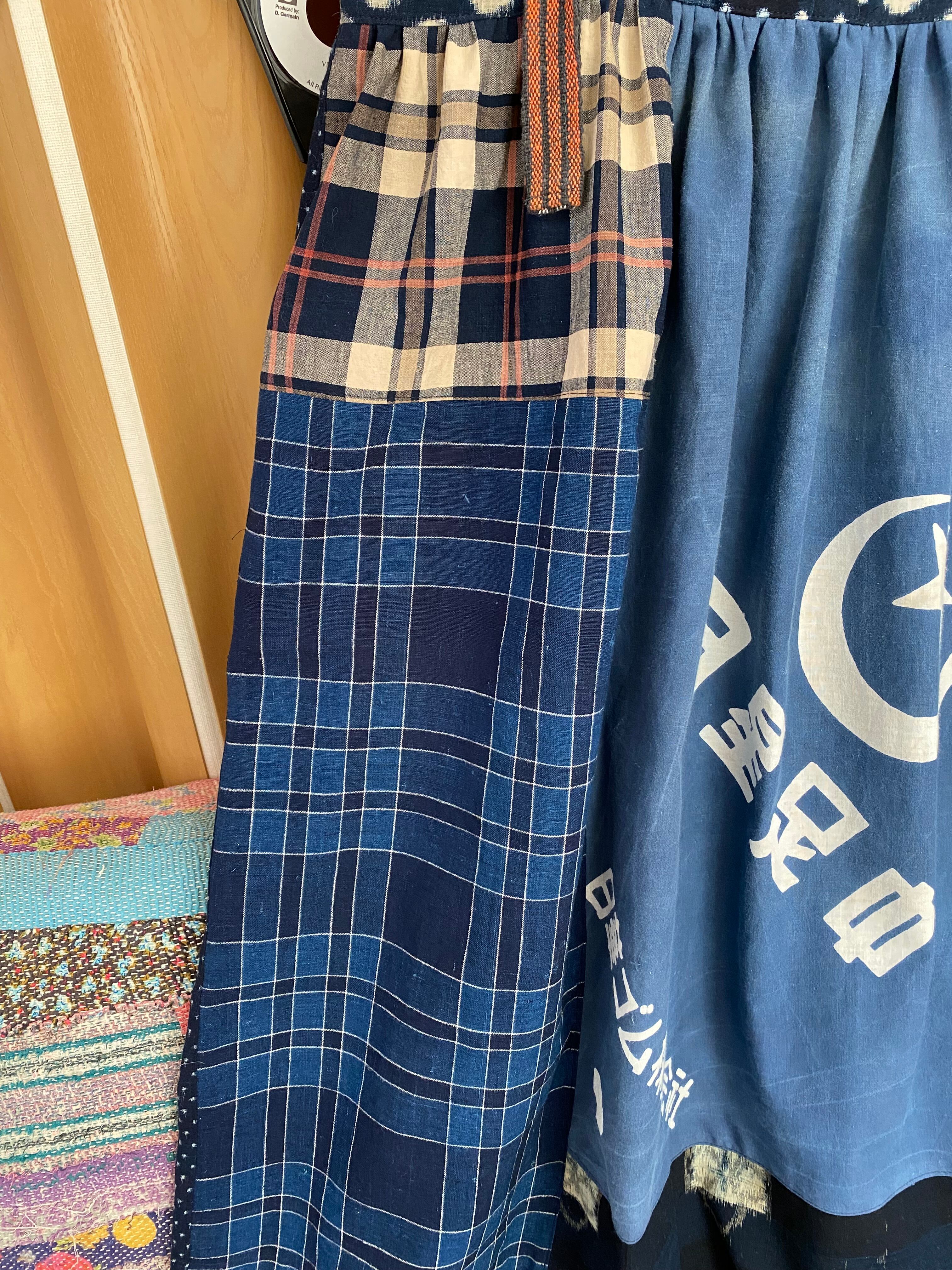 昭和時代の古い月星の風呂敷と、藍染めの古布の絣や襤褸、格子、縞、家紋などを組み合わせて、ジャンドレを作りました。