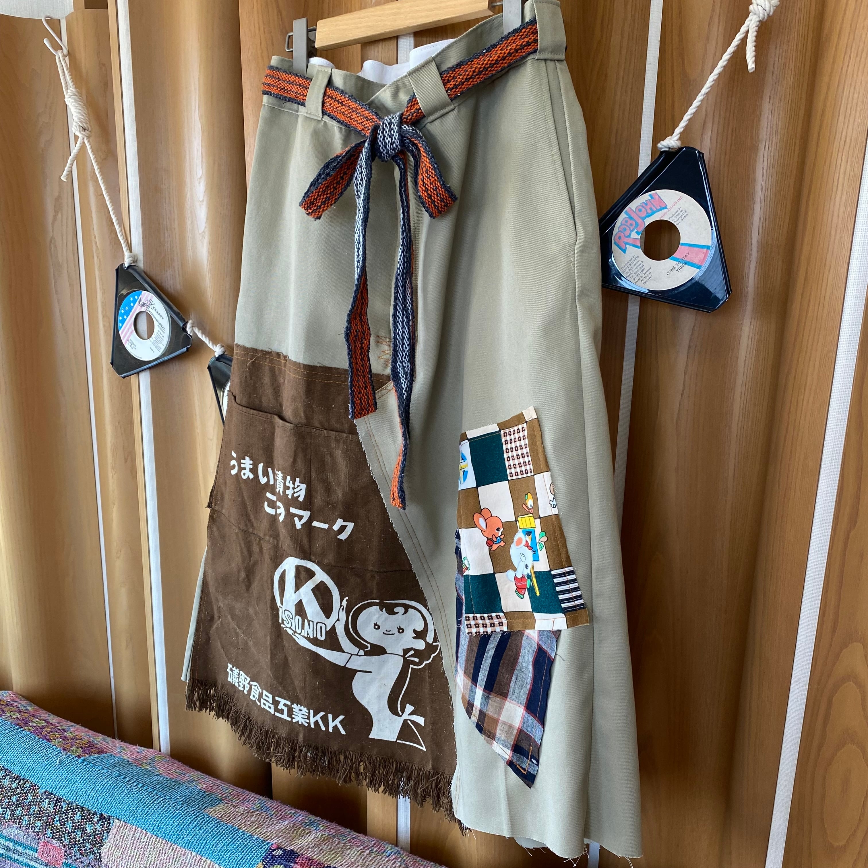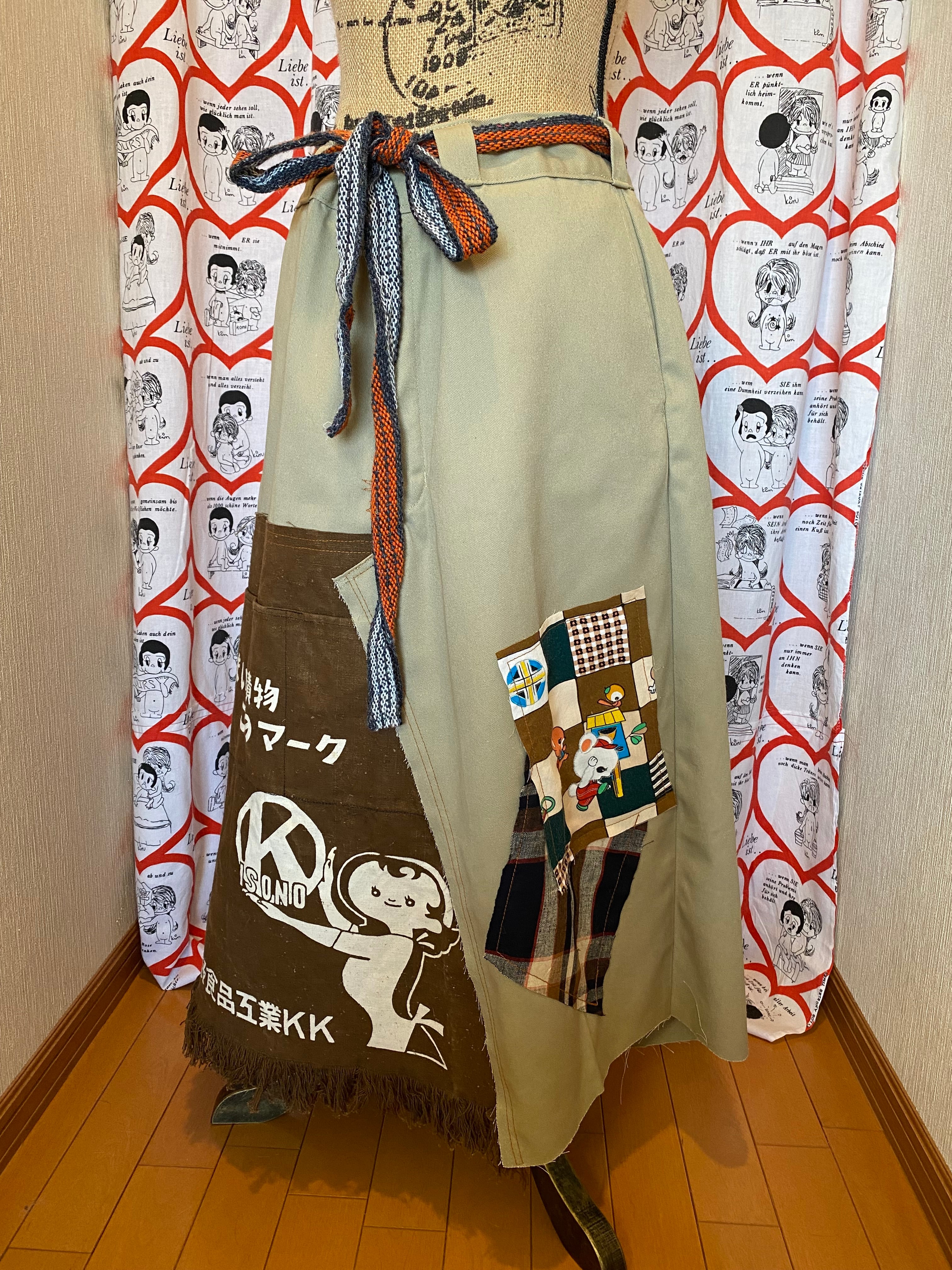 昭和レトロなイラストがかわいい前掛けとディッキーズ874の40インチの大きなチノパンを使ってスカートを作りました。