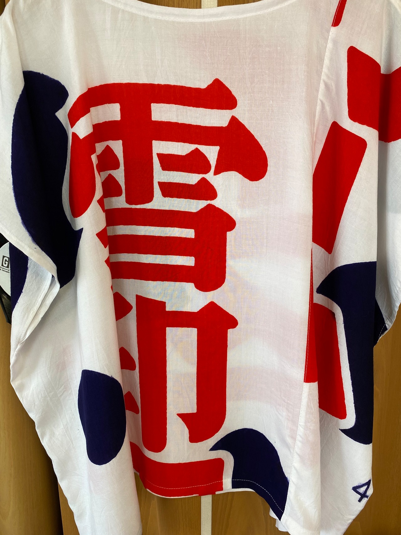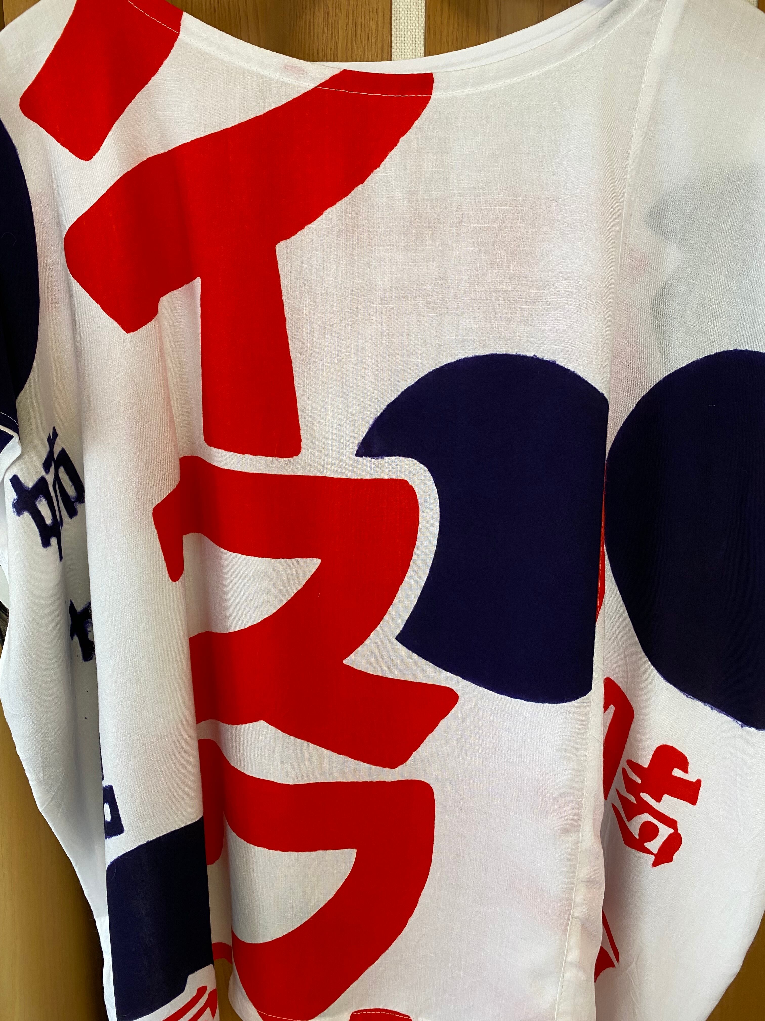 I made a loose-fitting poncho blouse using deadstock advertising flags from the Showa era for Snow Brand Ice Cream.
